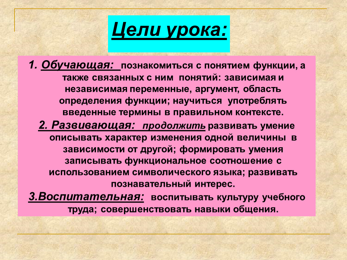 2. Развивающая: продолжить развивать умение описывать характер изменения одной величины в зависимости от другой; формировать умения записывать функциональное соотношение с использованием символического языка; развивать познавательный интерес.