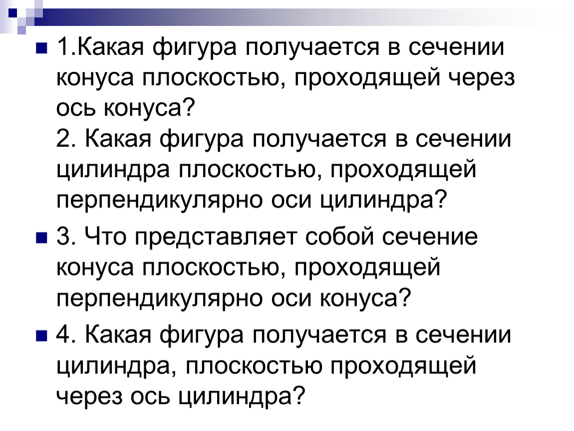 1.Какая фигура получается в сечении конуса плоскостью, проходящей через ось конуса?2. Какая фигура получается в сечении цилиндра плоскостью, проходящей перпендикулярно оси цилиндра?