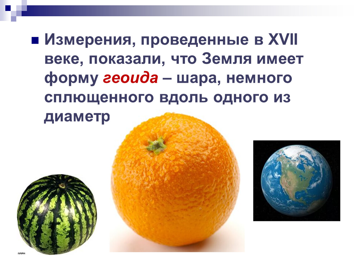 Измерения, проведенные в XVII веке, показали, что Земля имеет форму геоида – шара, немного сплющенного вдоль одного из диаметров – оси Земли.