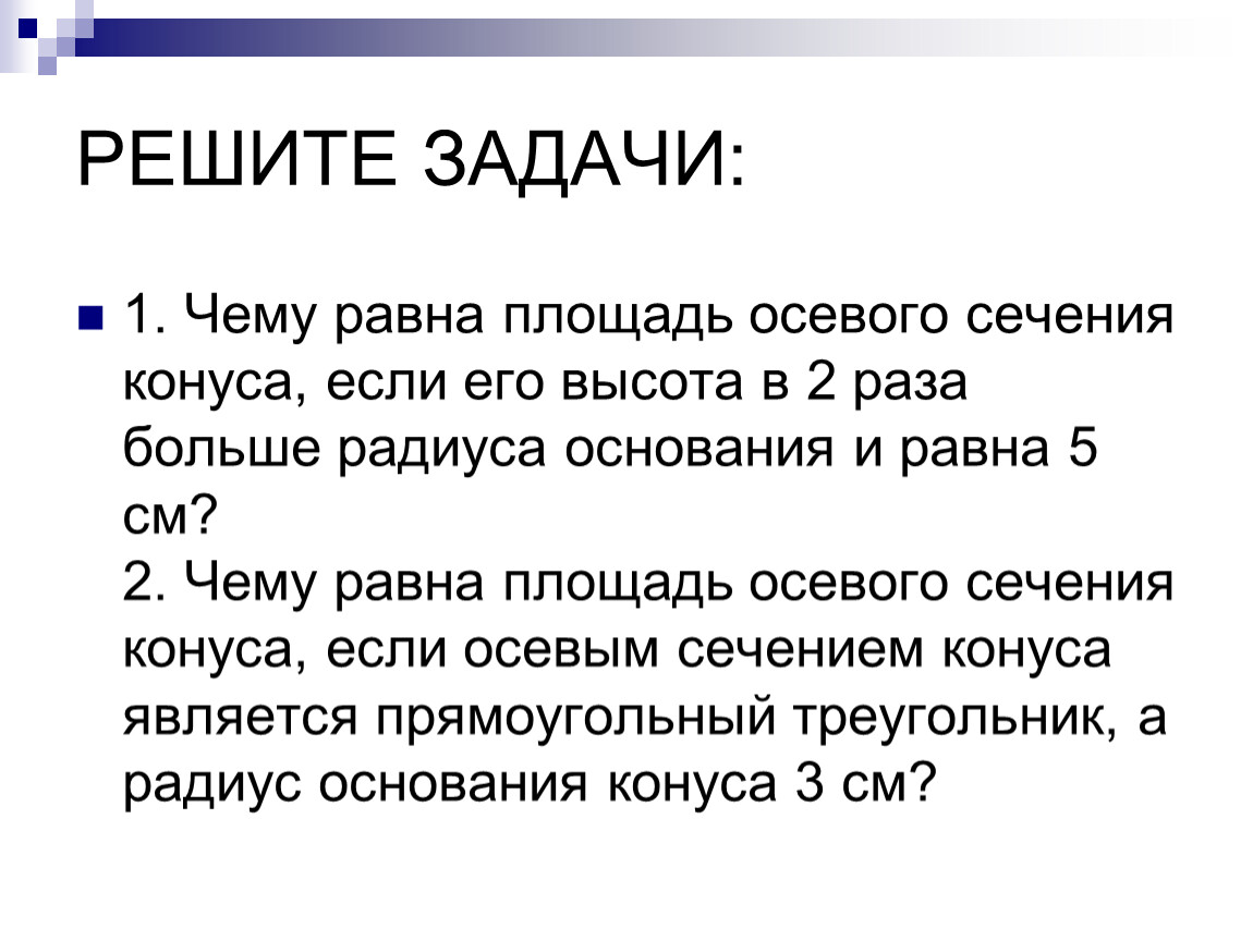 1. Чему равна площадь осевого сечения конуса, если его высота в 2 раза больше радиуса основания и равна 5 см?2. Чему равна площадь осевого сечения конуса, если осевым сечением конуса является прямоугольный треугольник, а радиус основания конуса 3 см?