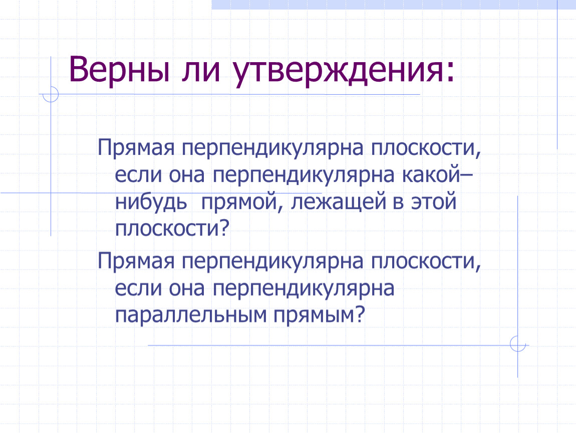 Прямая перпендикулярна плоскости, если она перпендикулярна какой–нибудь прямой, лежащей в этой плоскости?