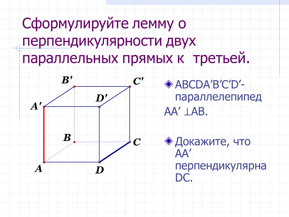 Сформулируйте лемму о перпендикулярности двух параллельных прямых к третьей.