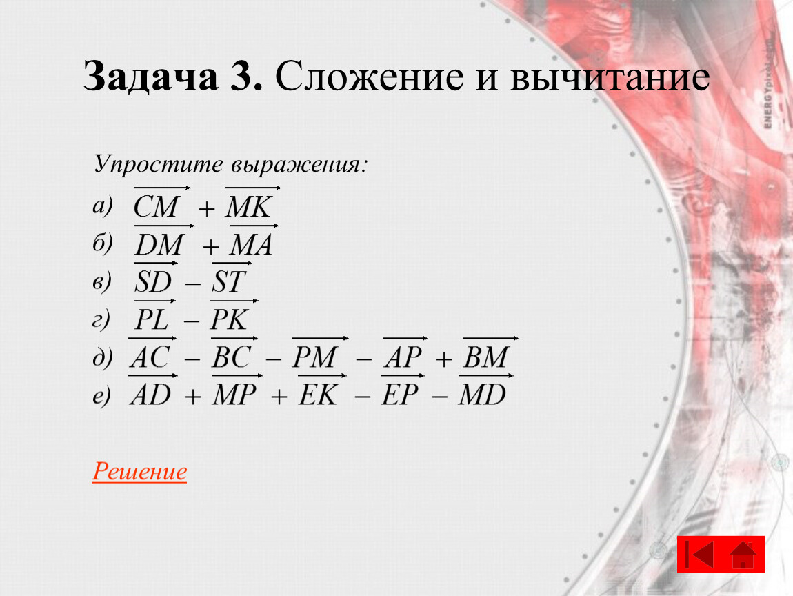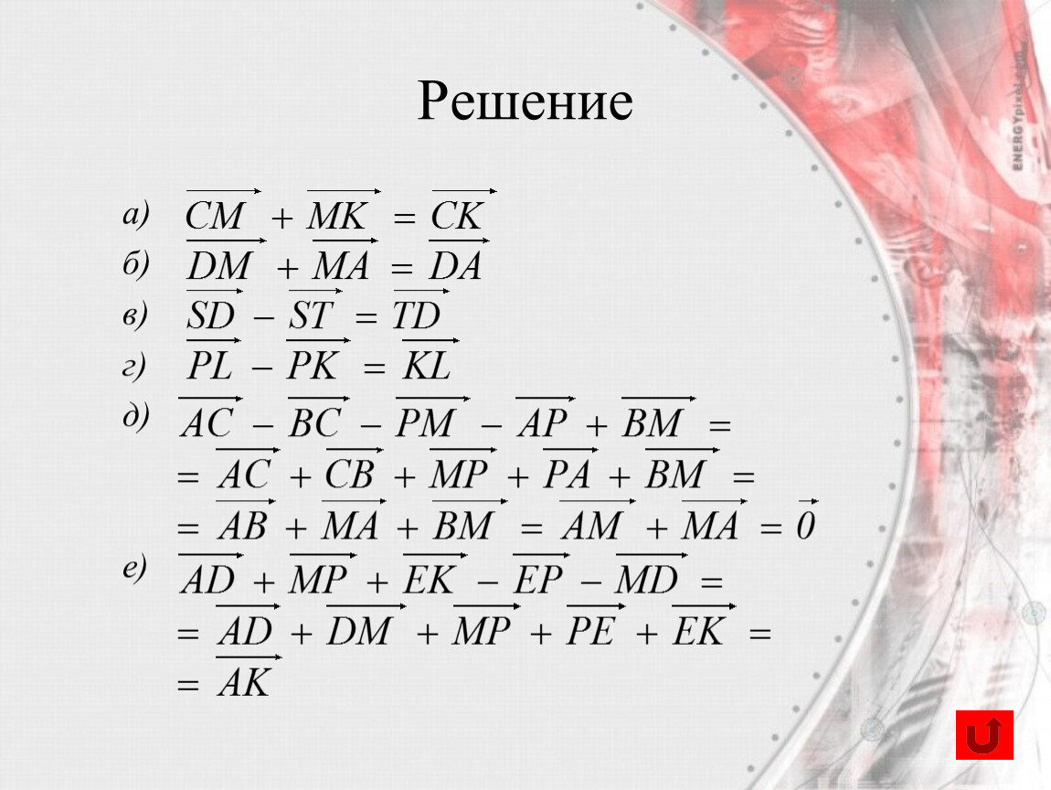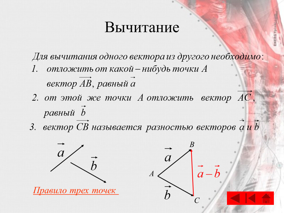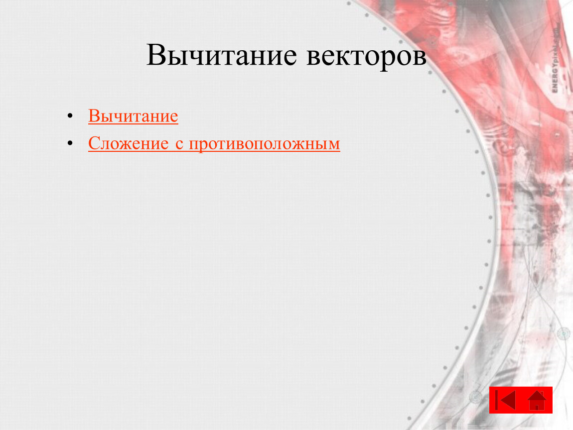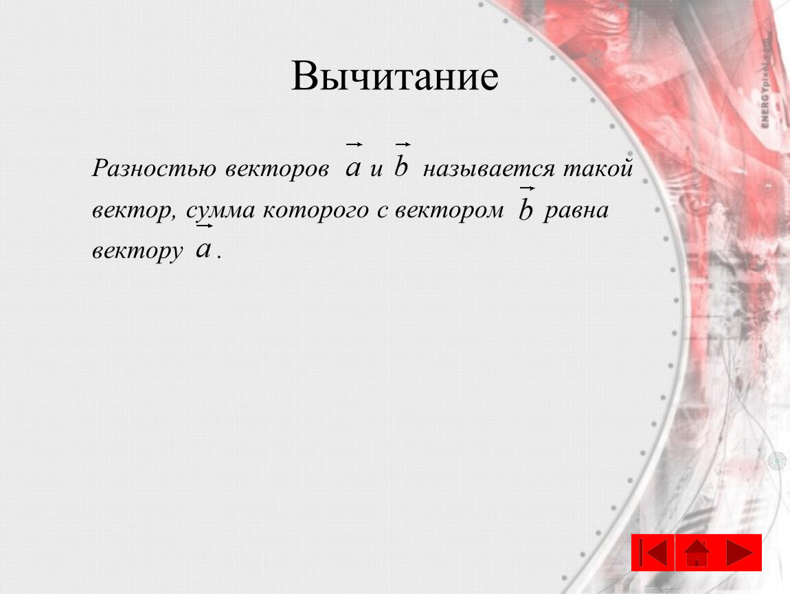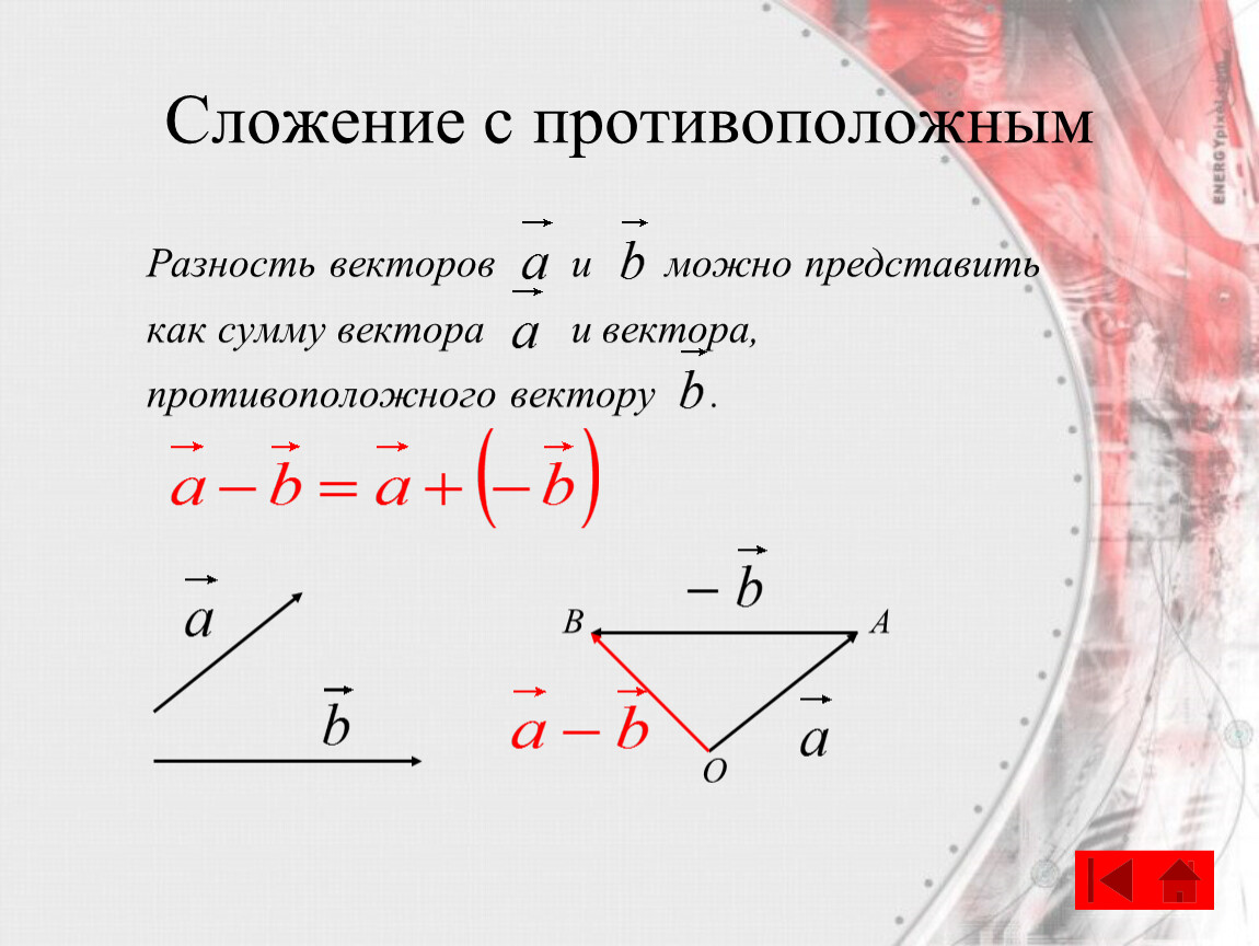 Разность векторов и можно представить как сумму вектора и вектора, противоположного вектору .