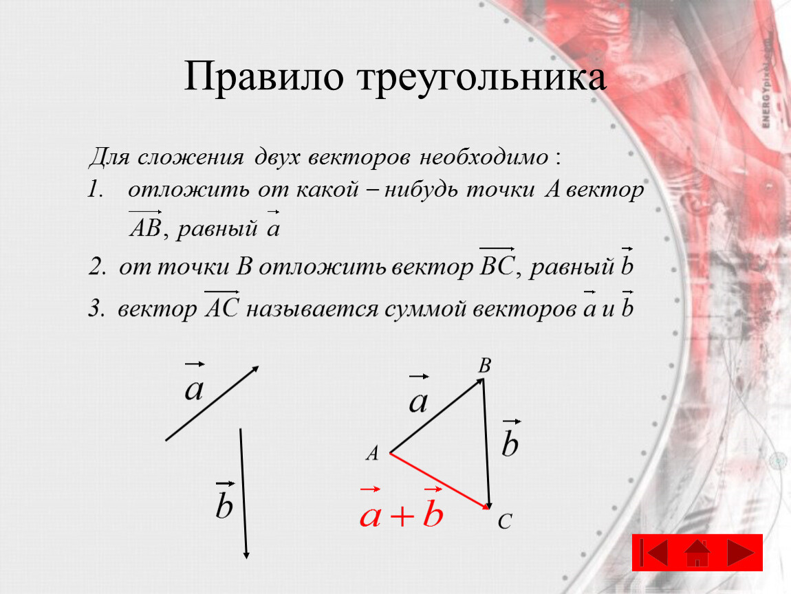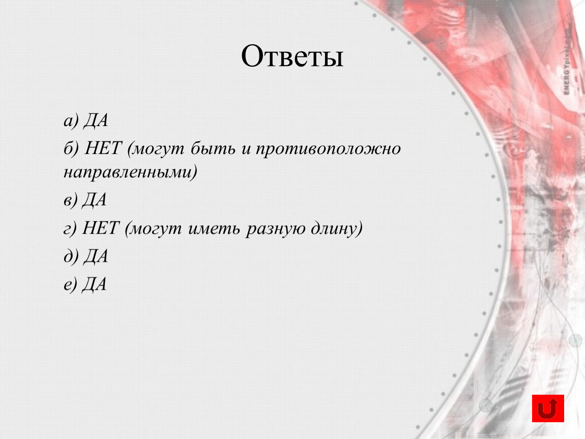 Противоположные векторы – противоположно направленные векторы, длины которых равны.