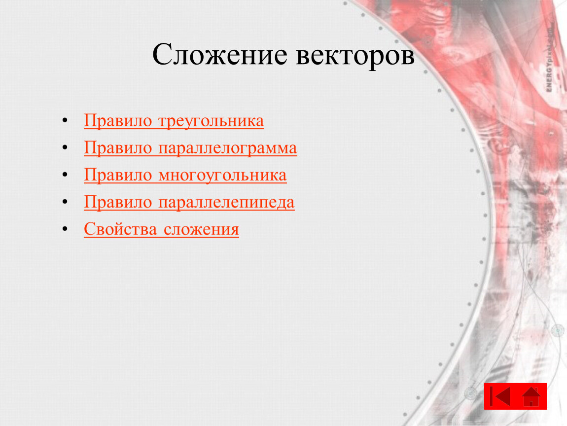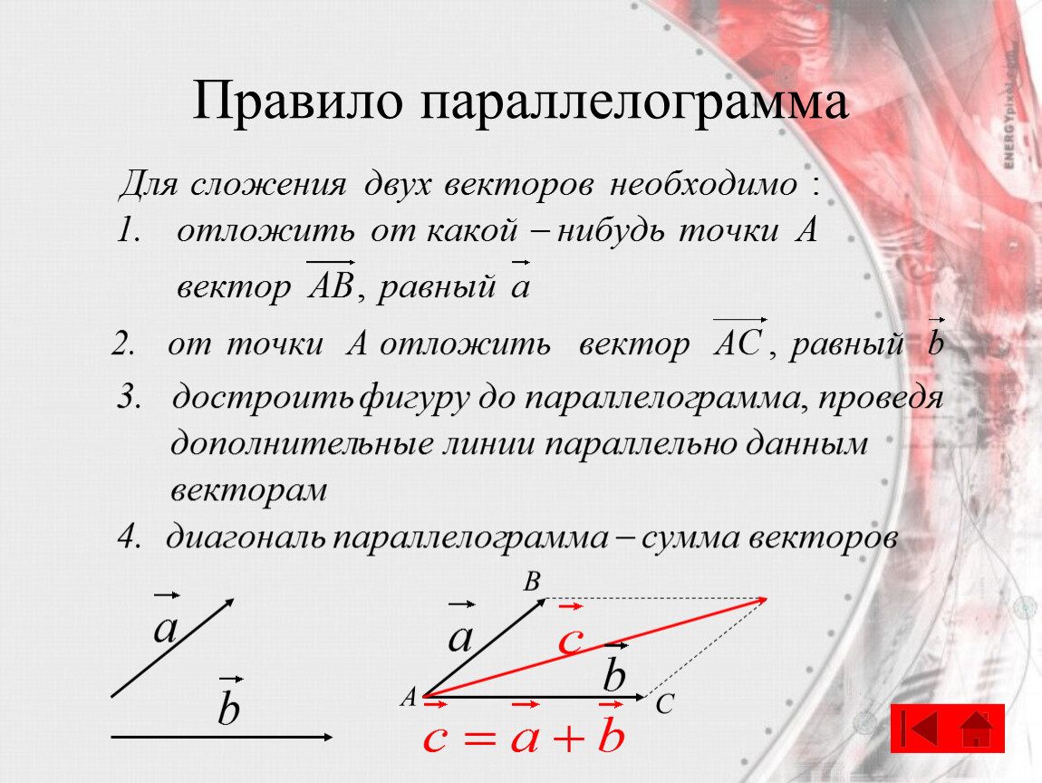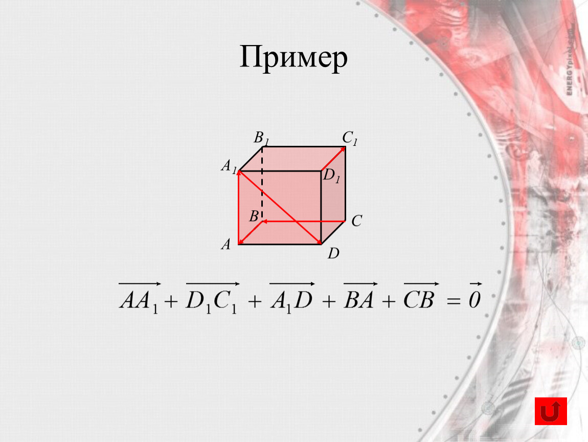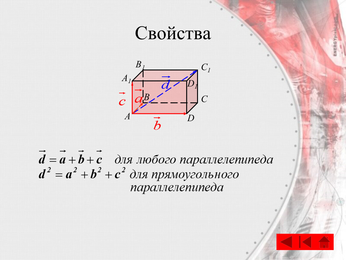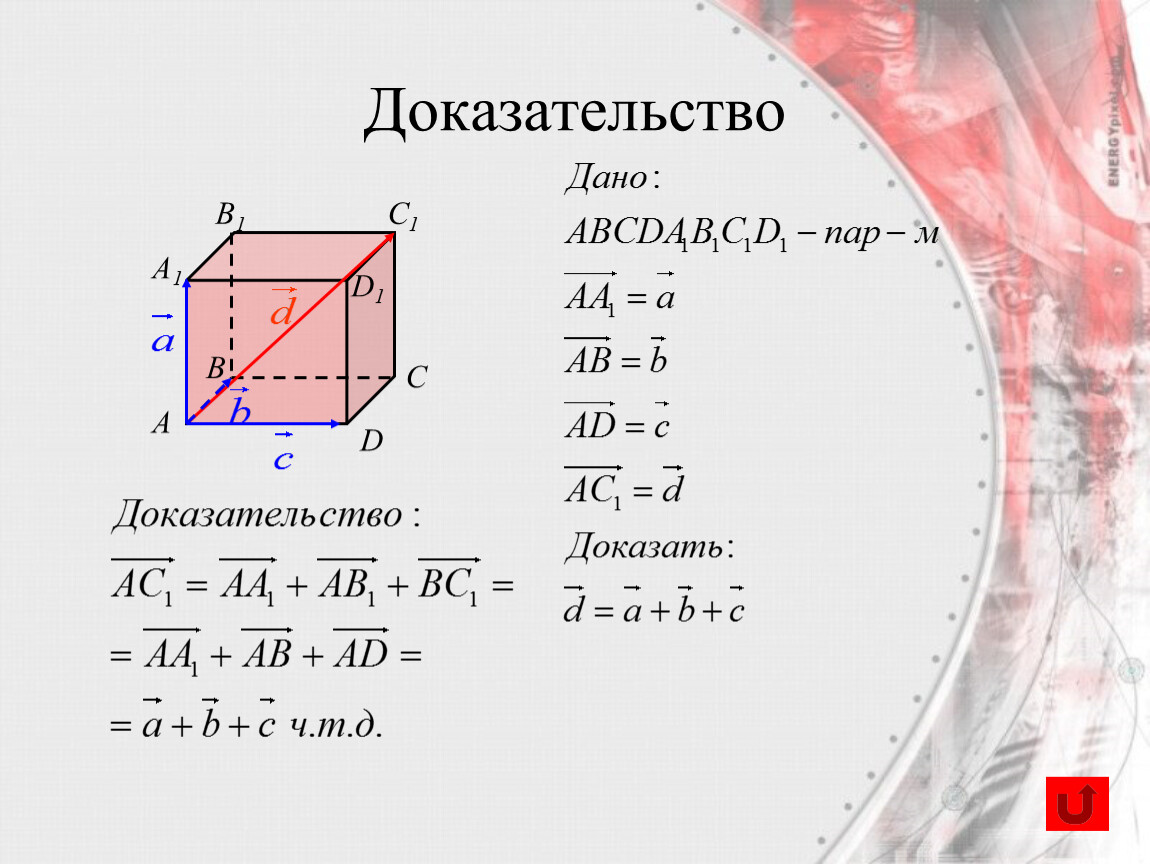 Вектор, лежащий на диагонали параллелепипеда, равен сумме векторов, проведенных из той же точки и лежащих на трех измерениях параллелепипеда.