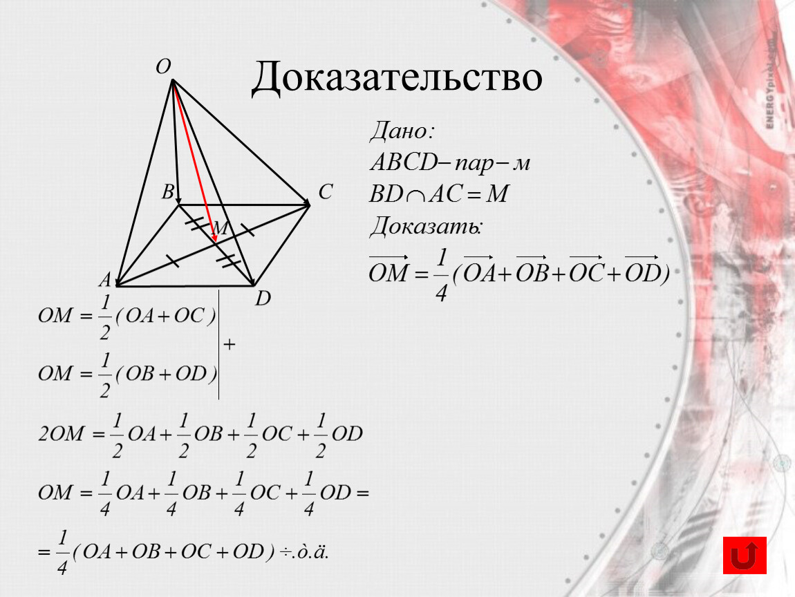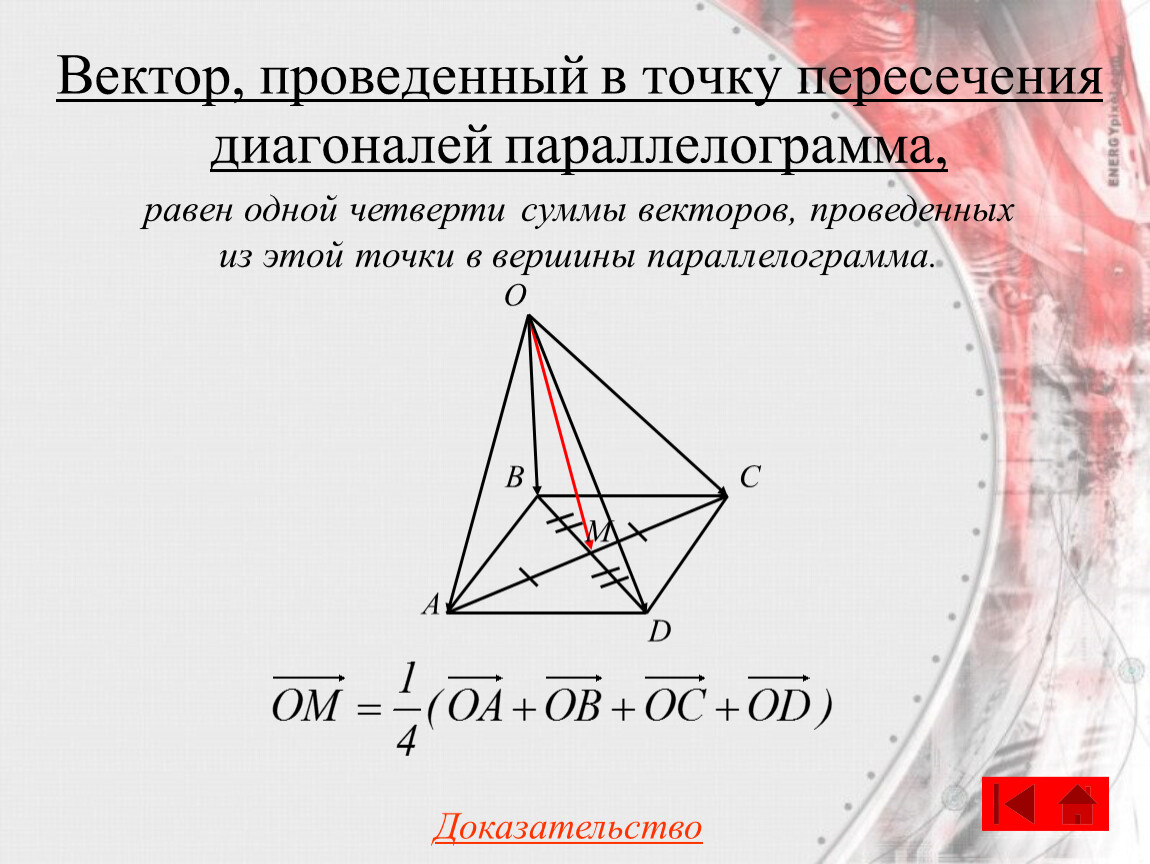 равен одной четверти суммы векторов, проведенных из этой точки в вершины параллелограмма.
