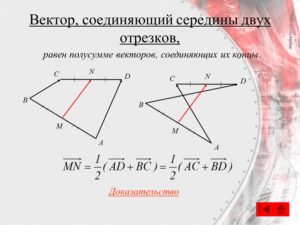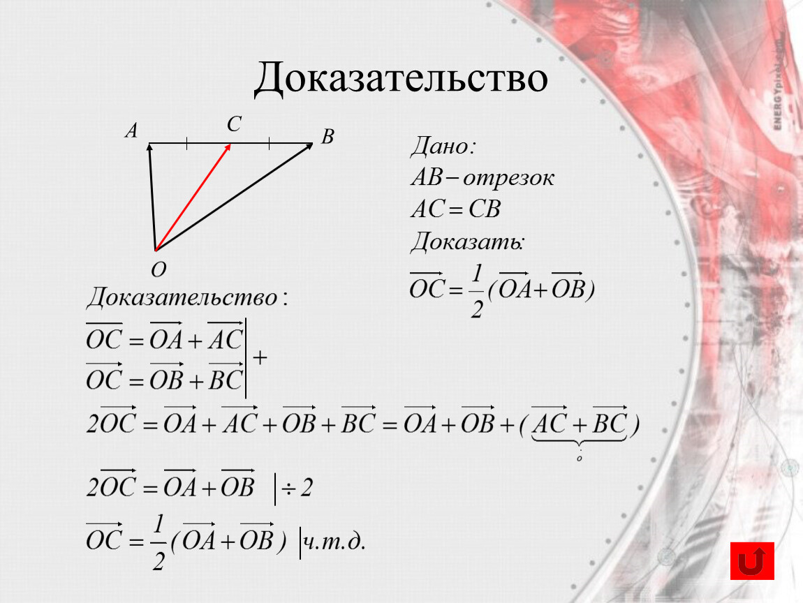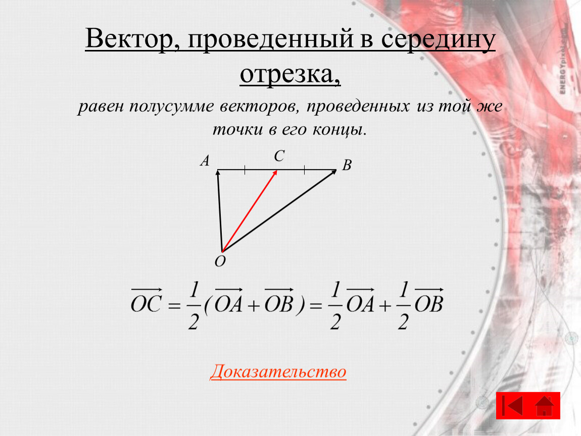 равен полусумме векторов, проведенных из той же точки в его концы.