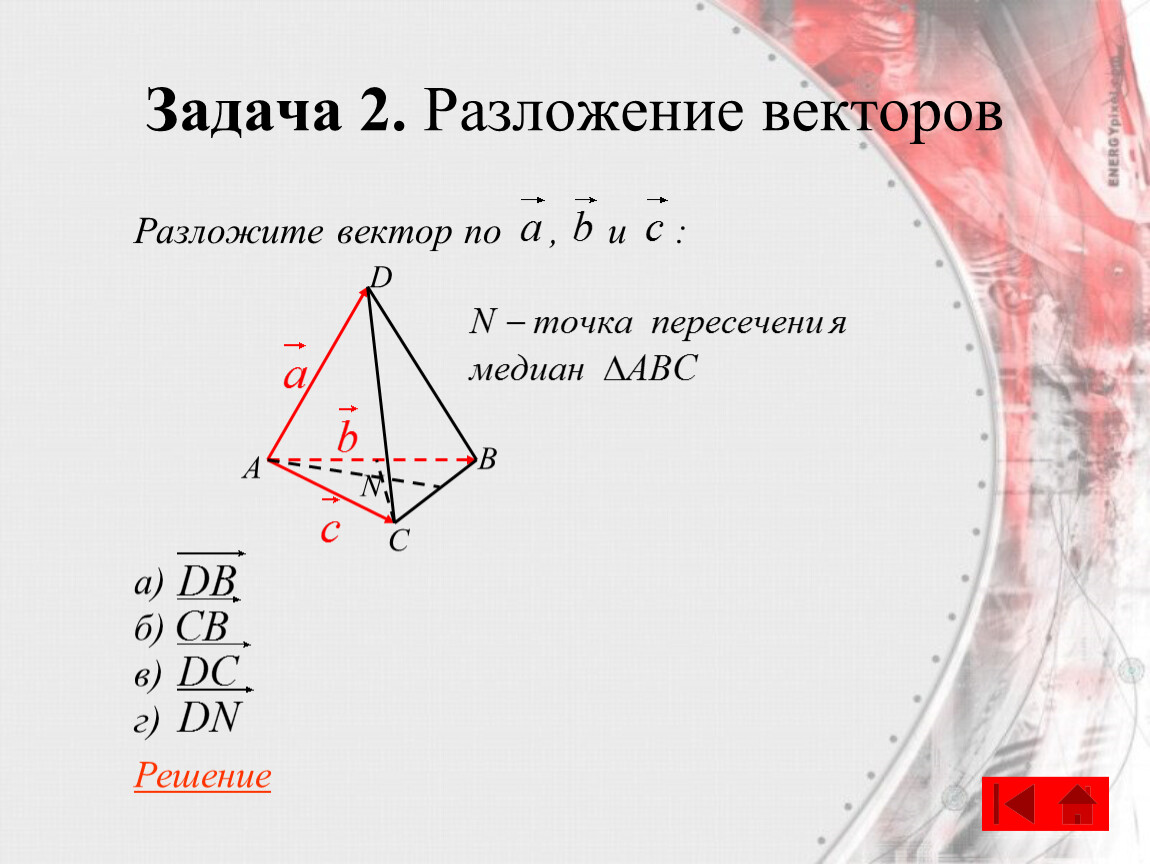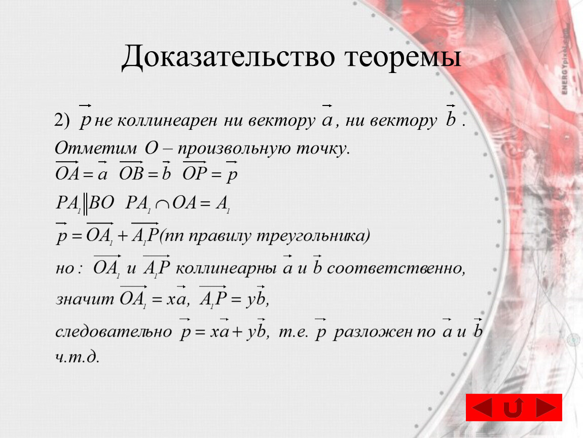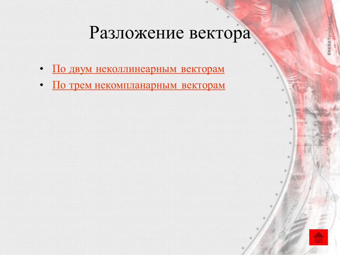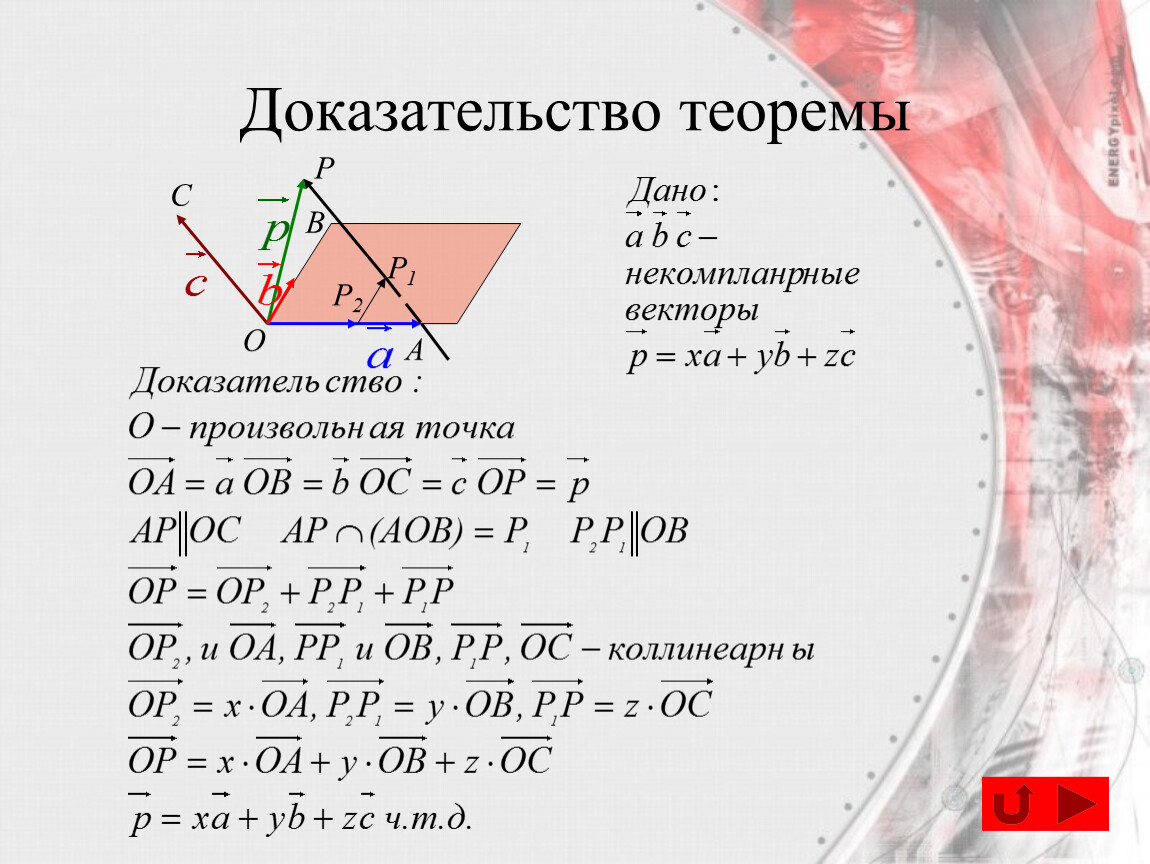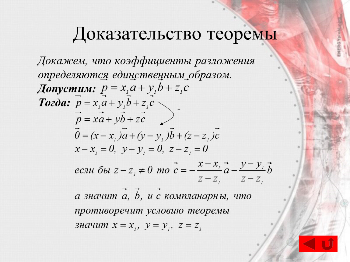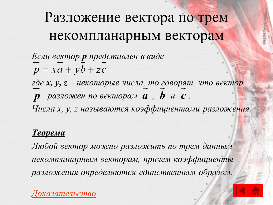 Любой вектор можно разложить по трем данным некомпланарным векторам, причем коэффициенты разложения определяются единственным образом.