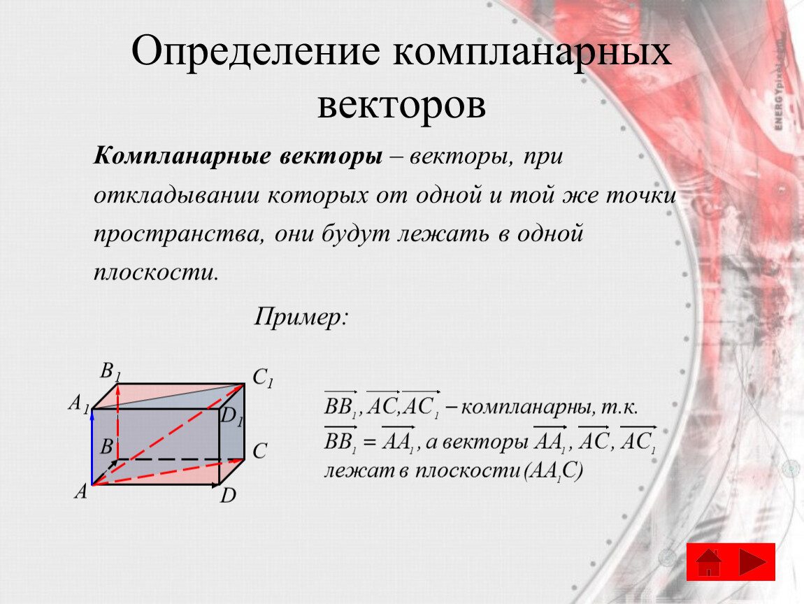 Компланарные векторы – векторы, при откладывании которых от одной и той же точки пространства, они будут лежать в одной плоскости.