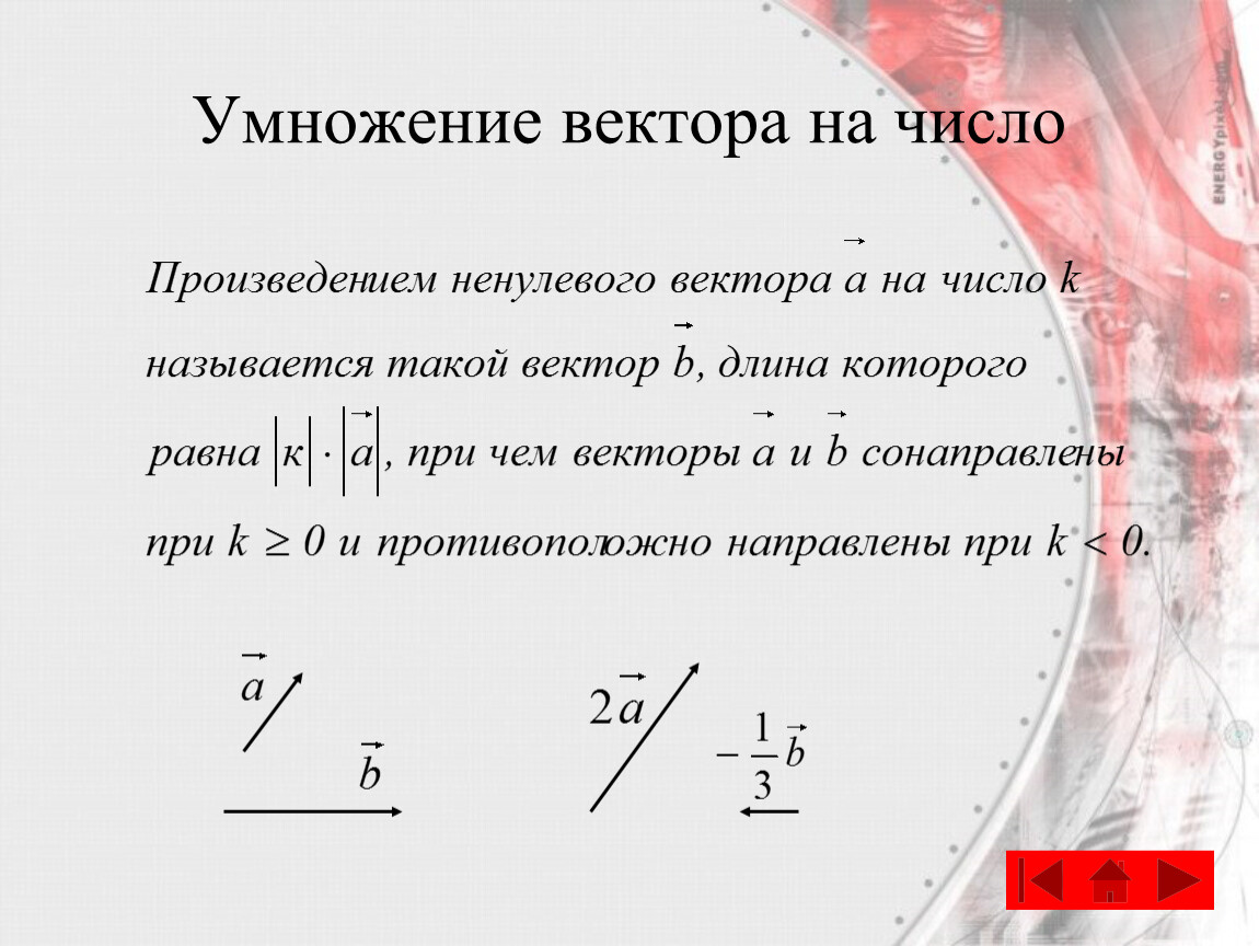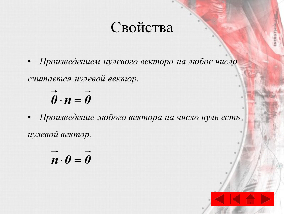 Произведением нулевого вектора на любое число считается нулевой вектор.