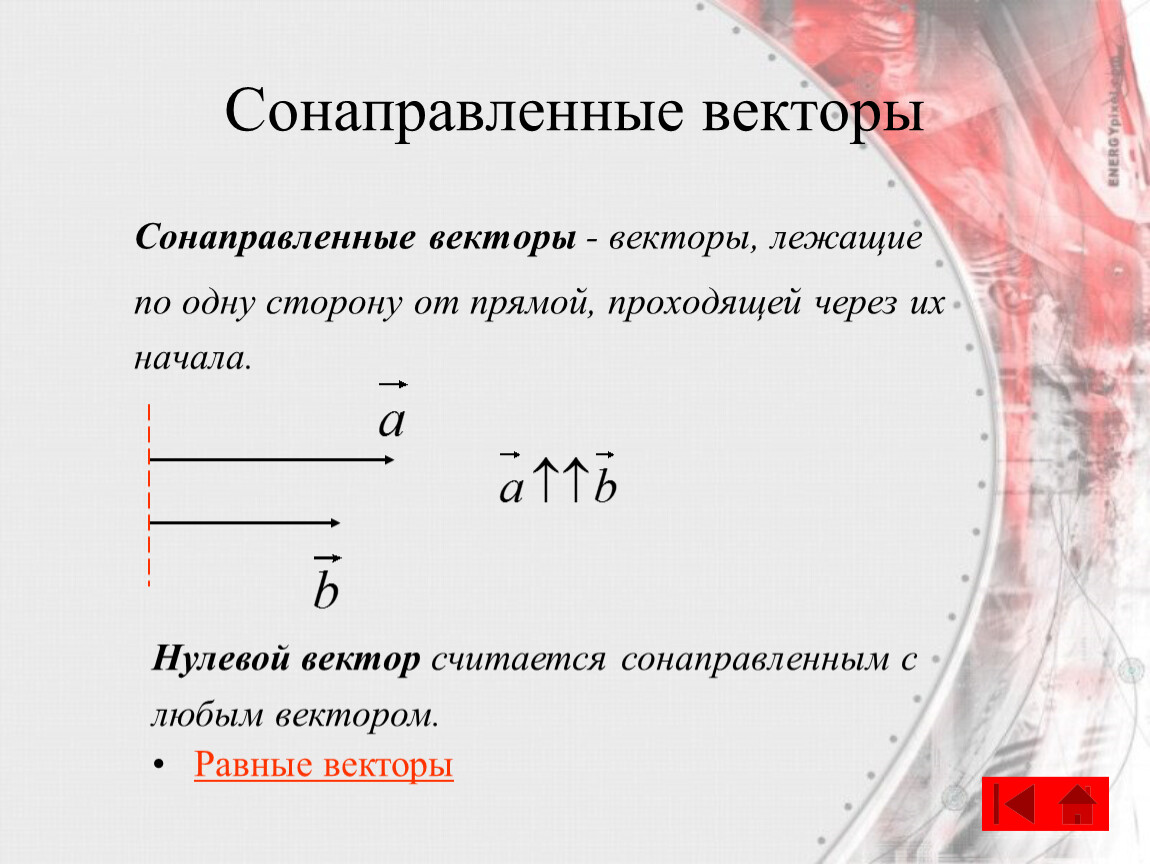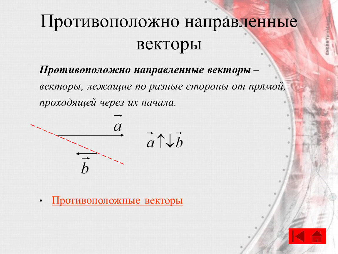 Противоположно направленные векторы – векторы, лежащие по разные стороны от прямой, проходящей через их начала.