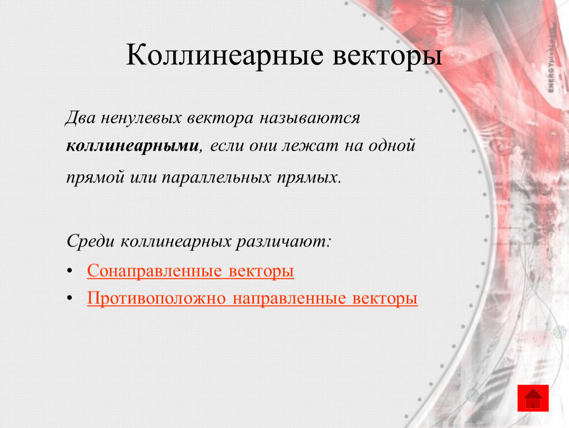 Два ненулевых вектора называются коллинеарными, если они лежат на одной