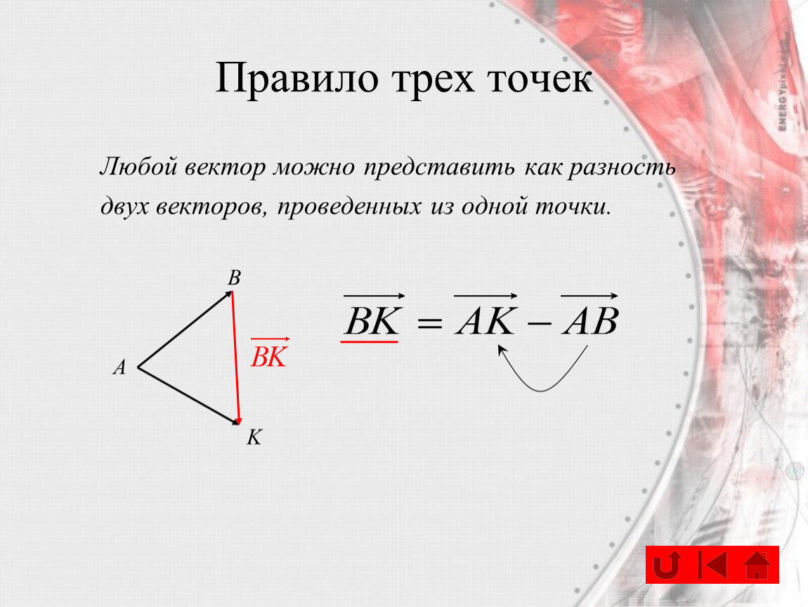 Любой вектор можно представить как разность двух векторов, проведенных из одной точки.