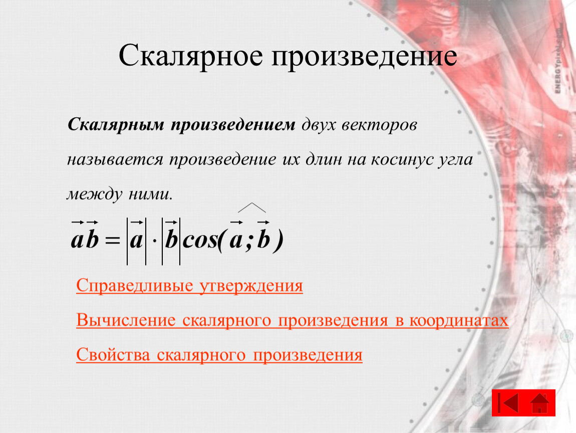 Скалярным произведением двух векторов называется произведение их длин на косинус угла между ними.