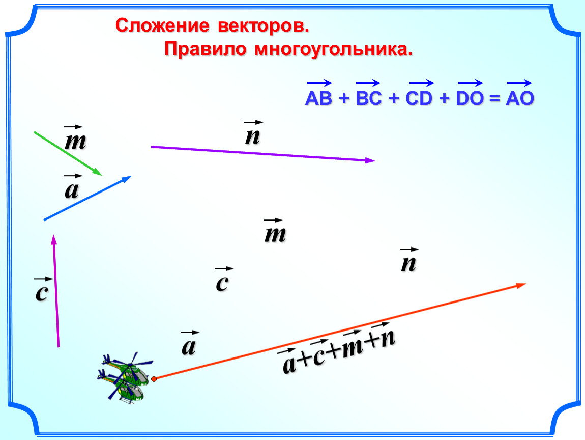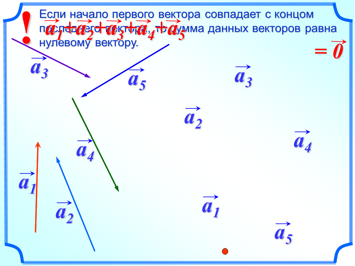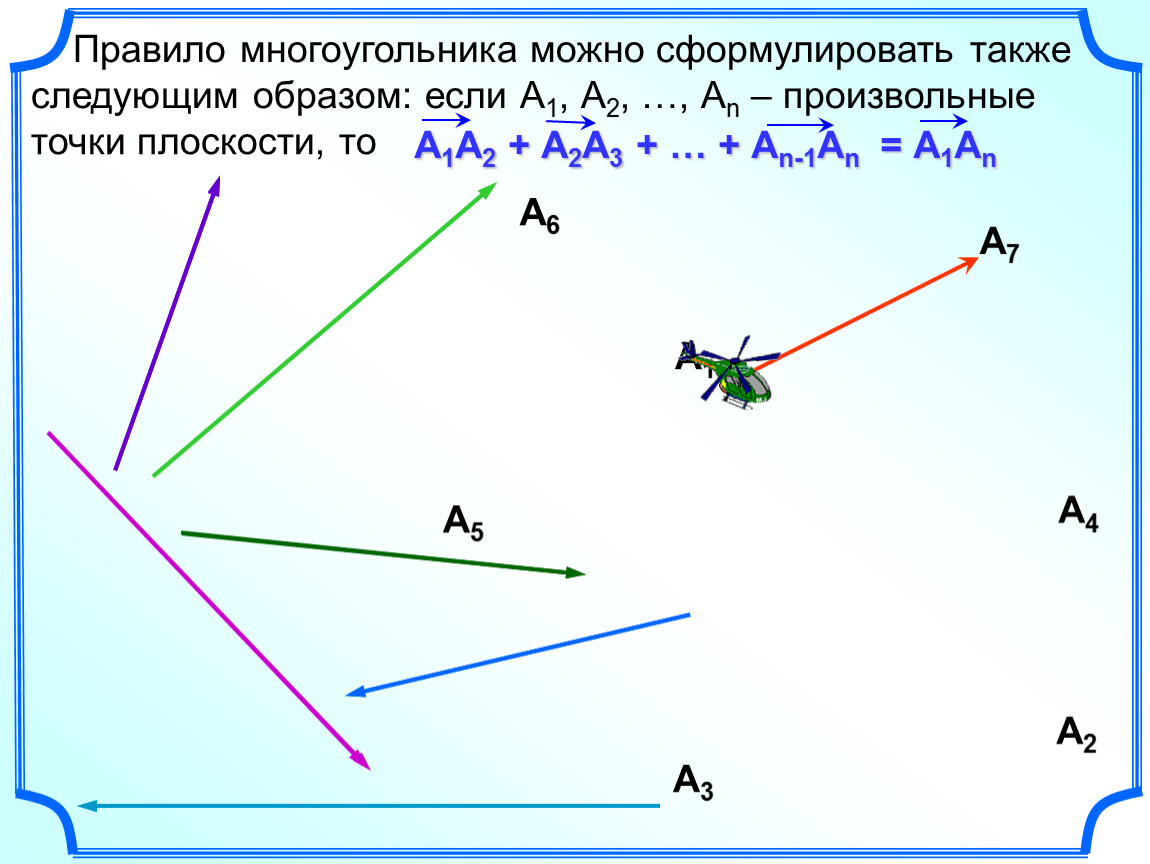 Правило многоугольника можно сформулировать также следующим образом: если А1, А2, …, Аn – произвольные точки плоскости, то