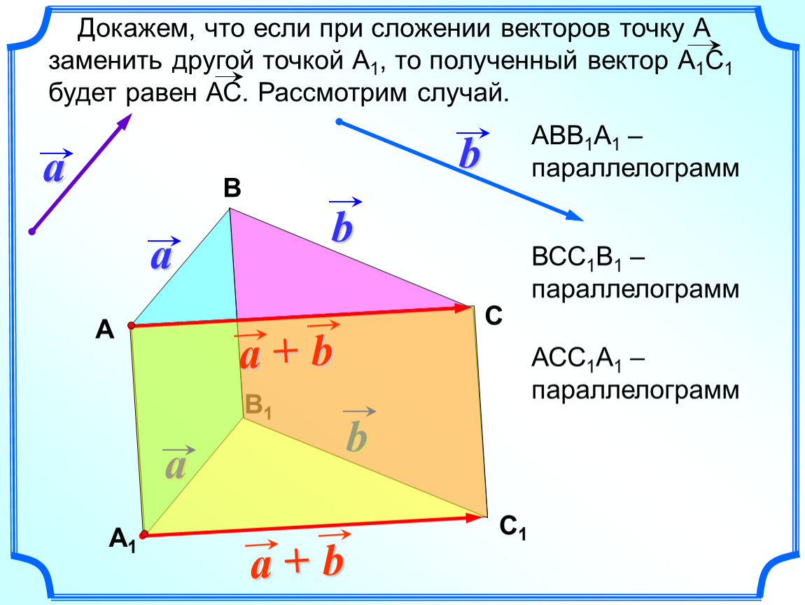 Докажем, что если при сложении векторов точку А заменить другой точкой А1, то полученный вектор А1С1