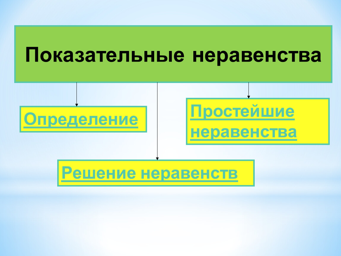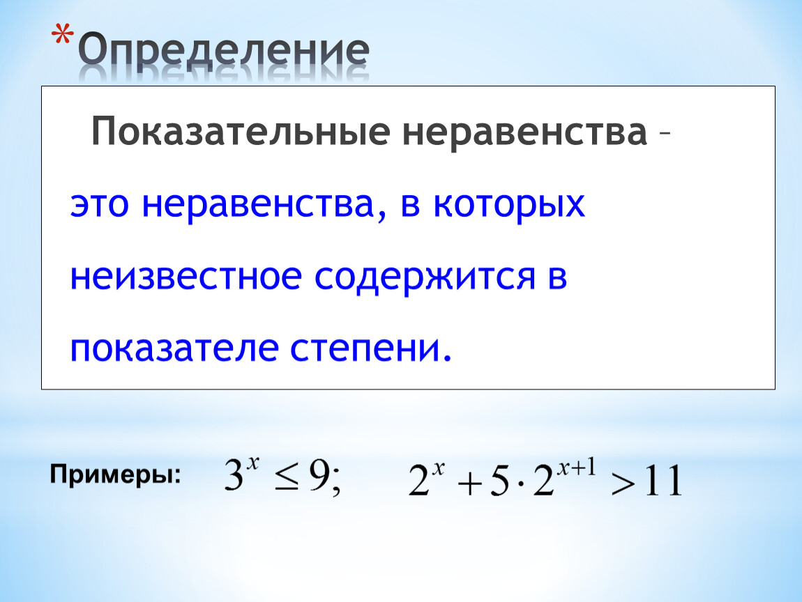 Показательные неравенства – это неравенства, в которых неизвестное содержится в показателе степени.