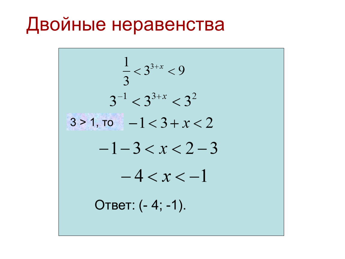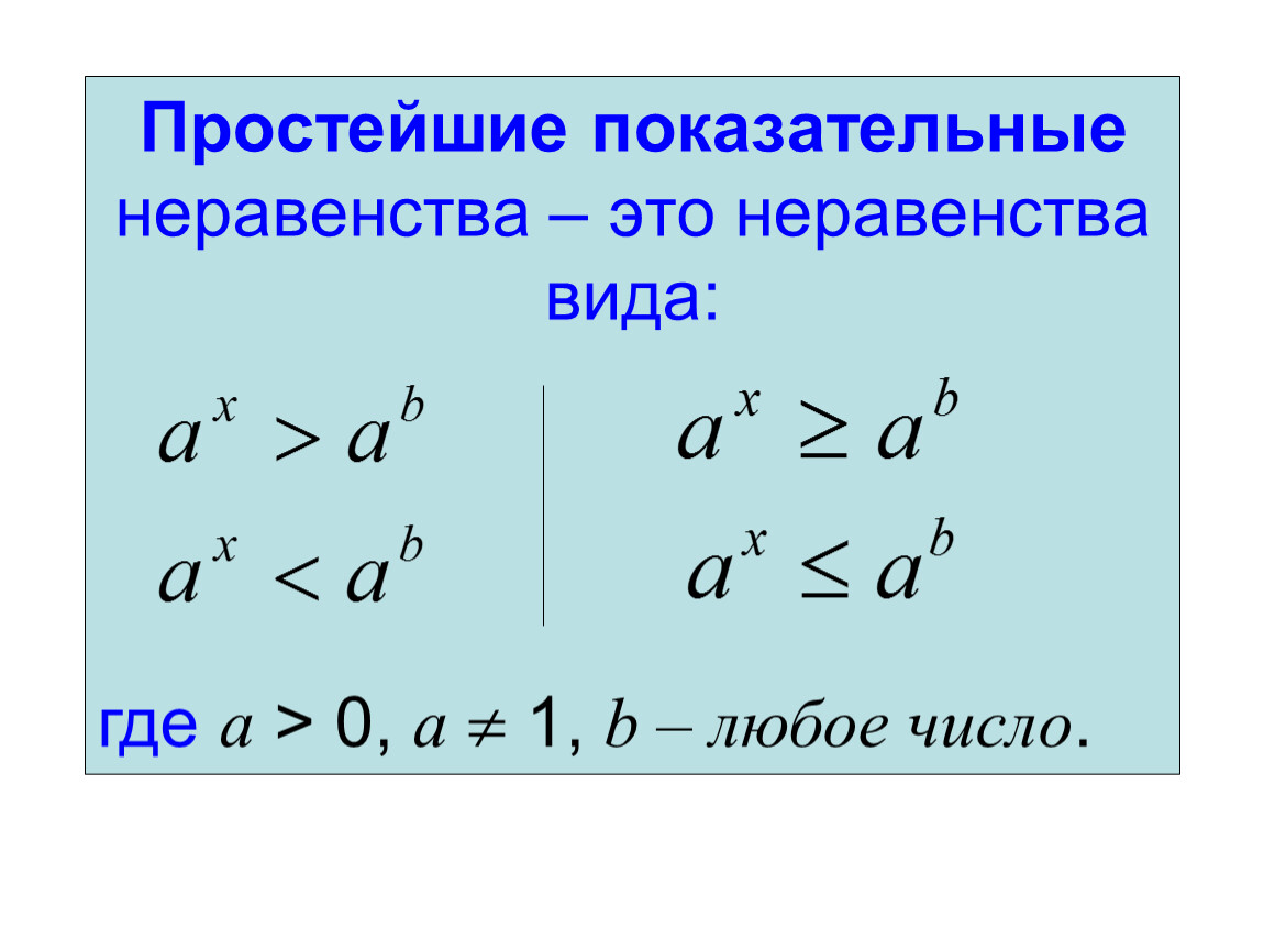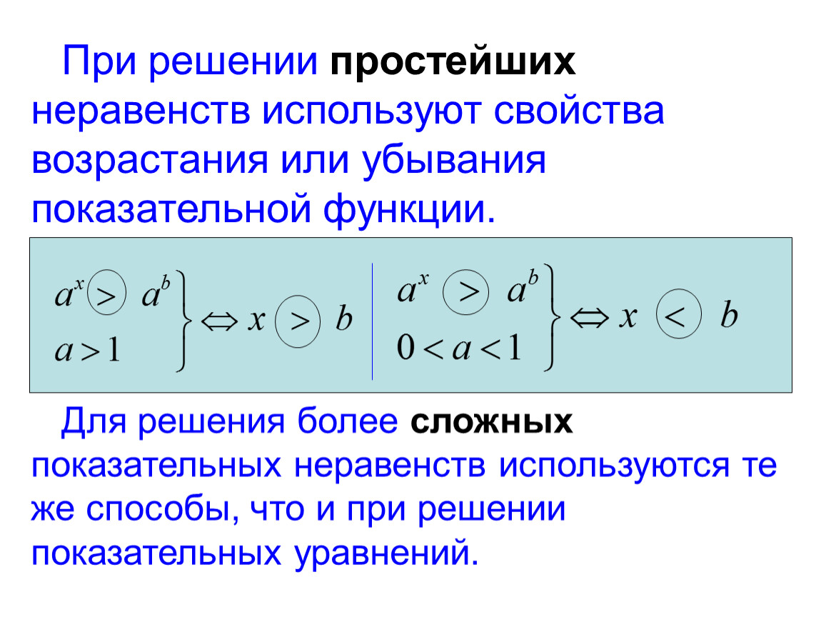 При решении простейших неравенств используют свойства возрастания или убывания показательной функции.