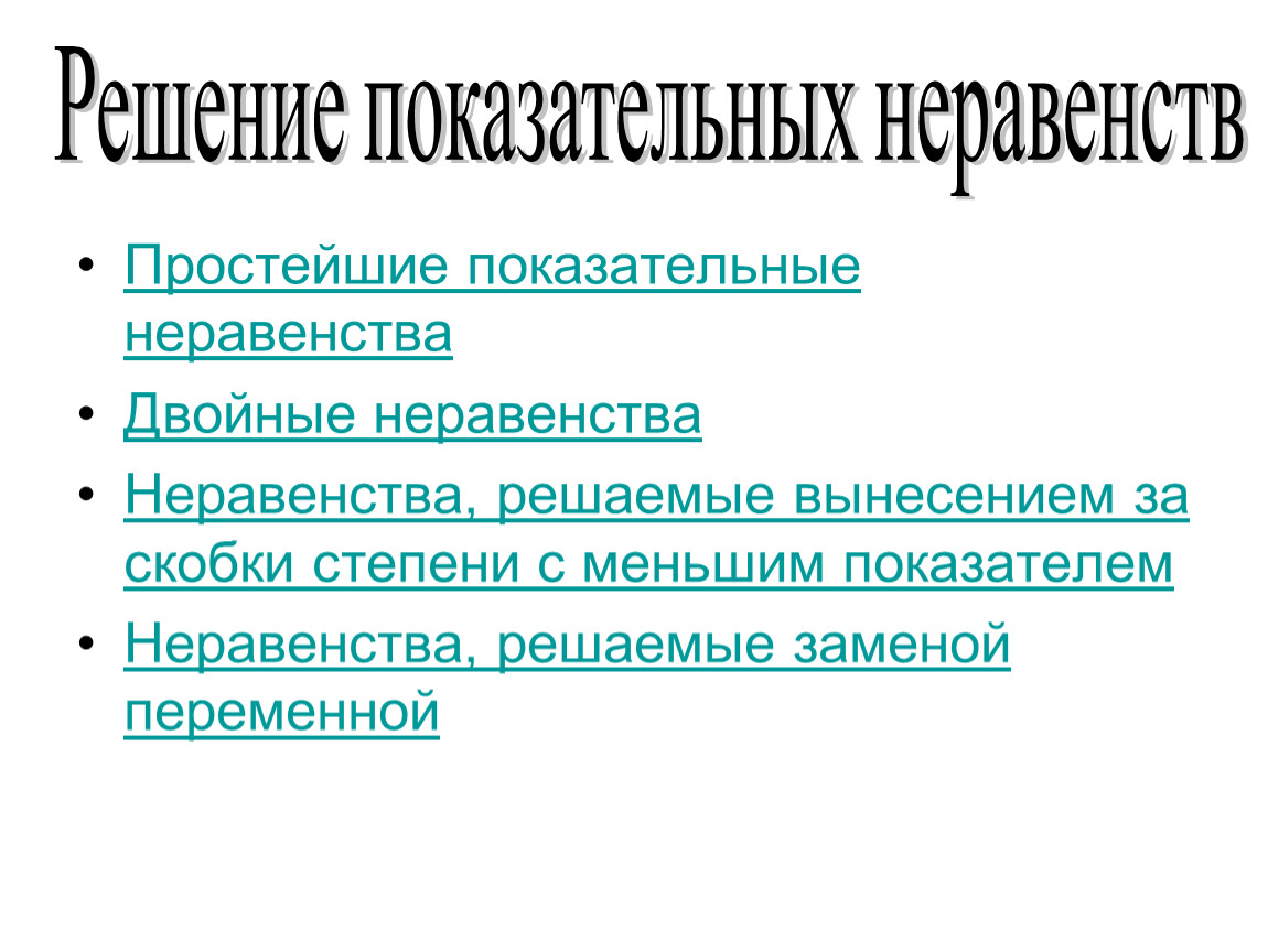 Для решения более сложных показательных неравенств используются те же способы, что и при решении показательных уравнений.
