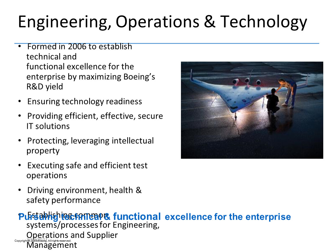 Formed in 2006 to establish technical and functional excellence for the enterprise by maximizing Boeing’s R&D yield