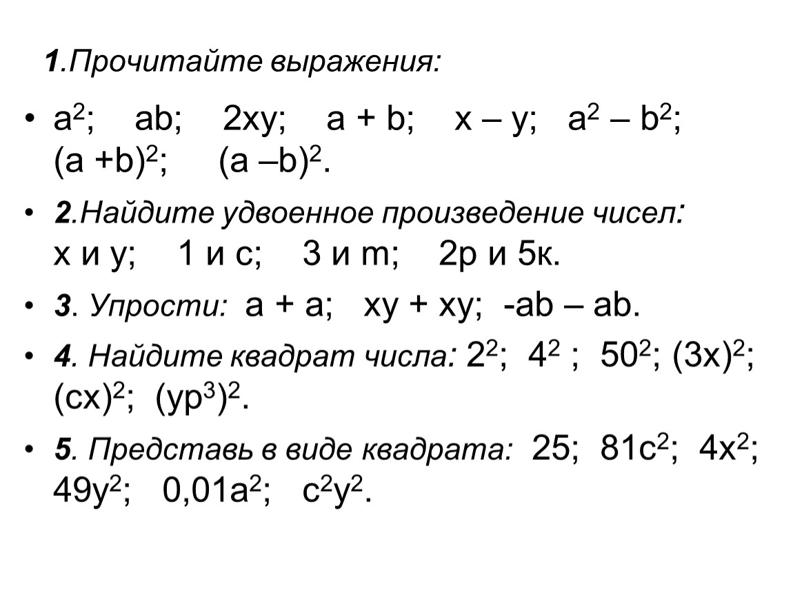 а2; аb; 2ху; a + b; х – у; а2 – b2; (а +b)2; (а –b)2.