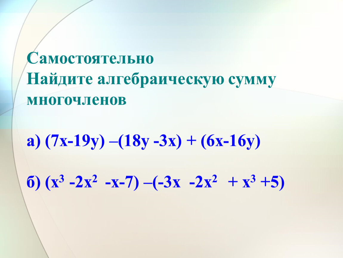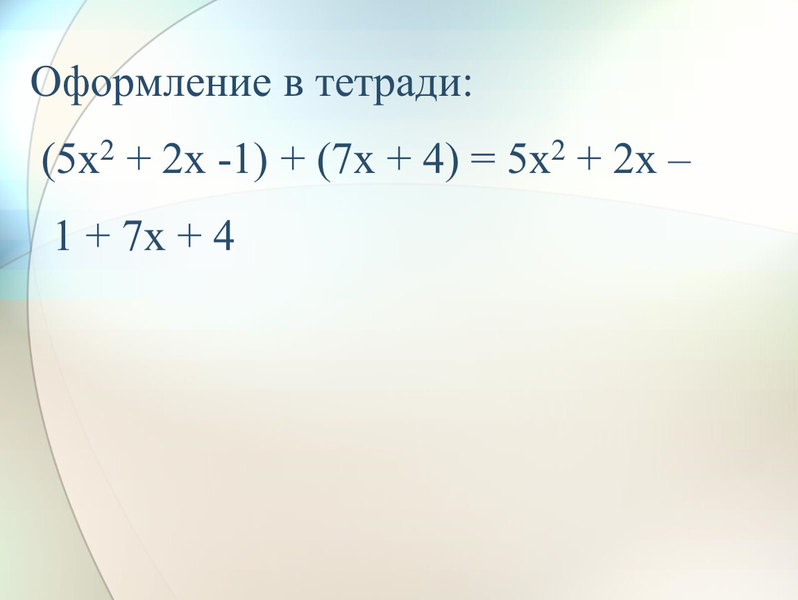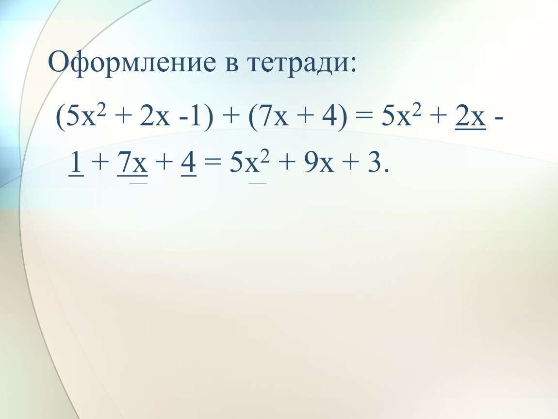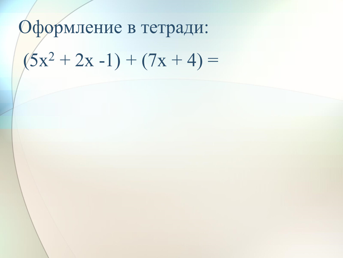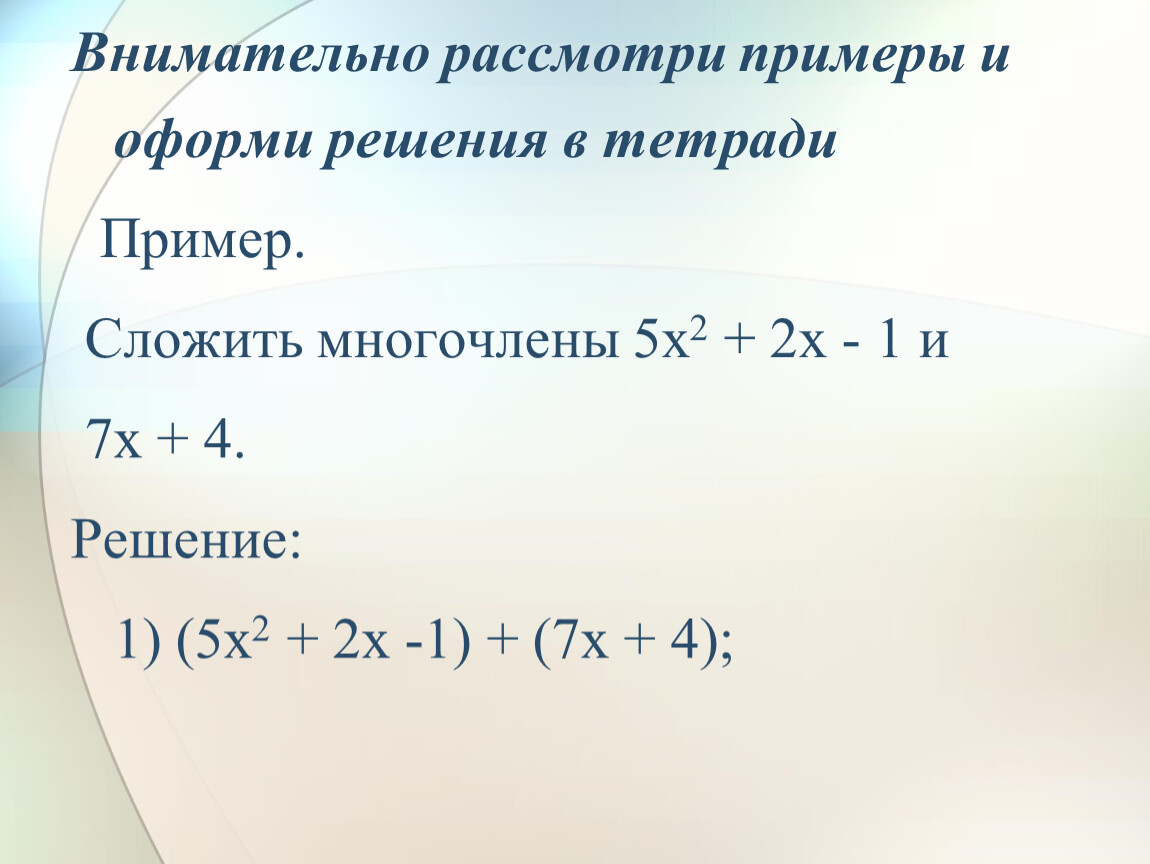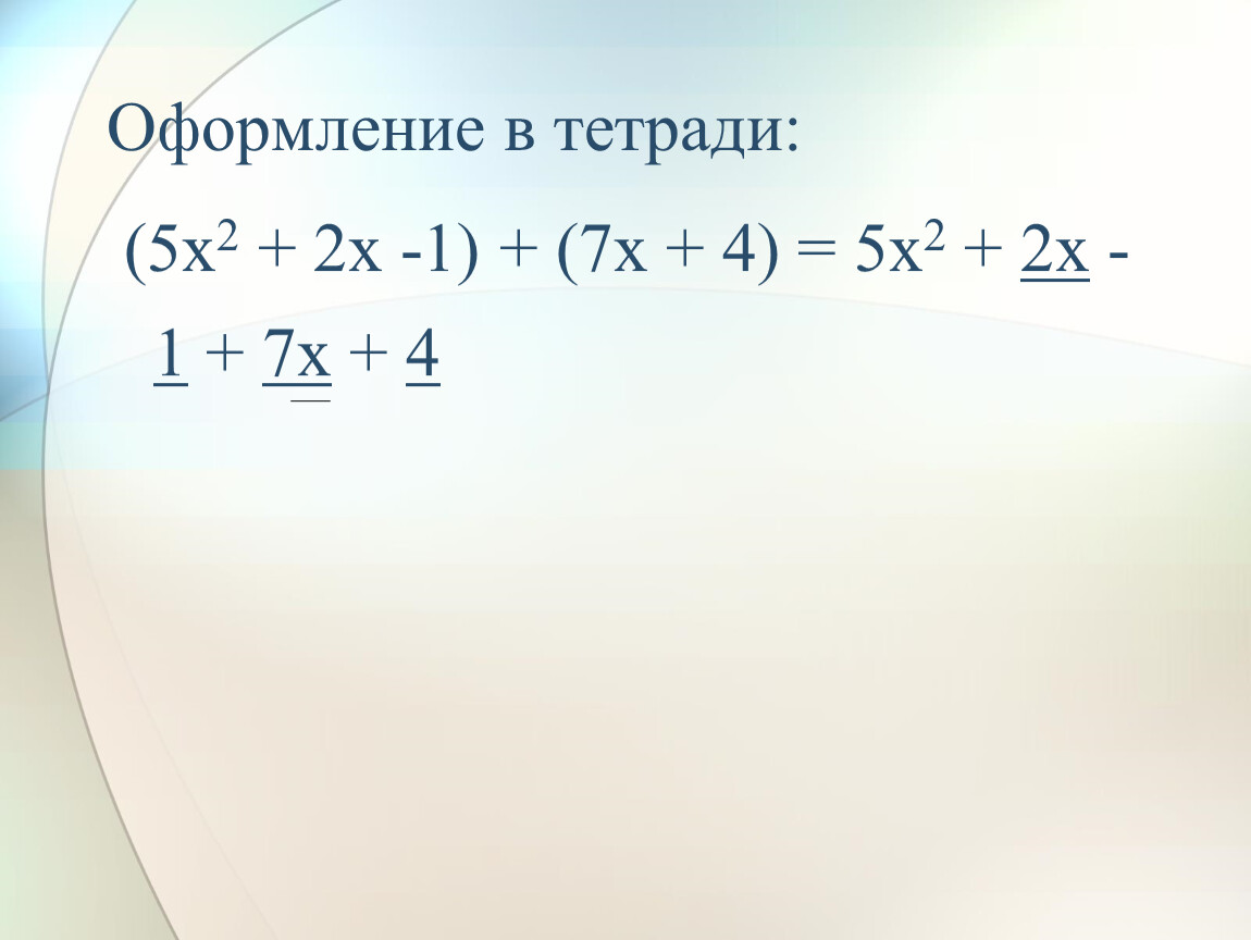 1) каждый многочлен записать в скобках и между скобками поставить знак "+";