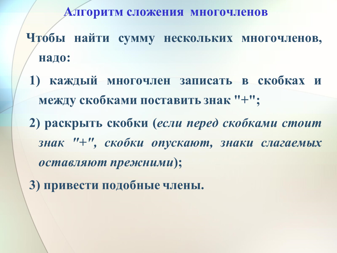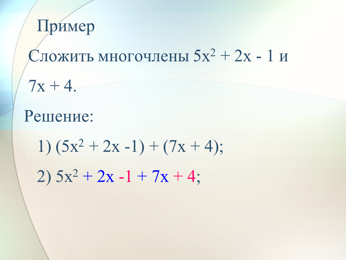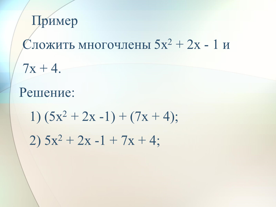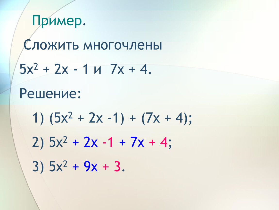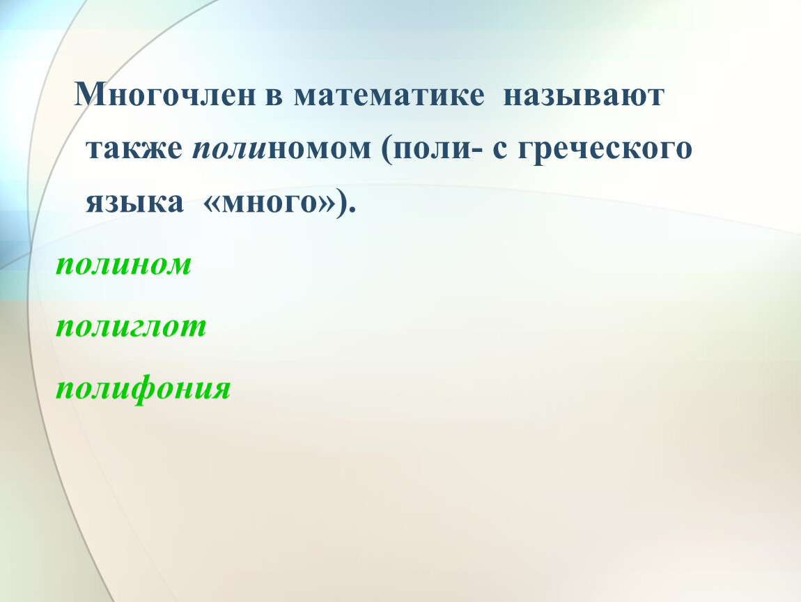 Многочлен в математике называют также полиномом (поли- с греческого языка «много»).