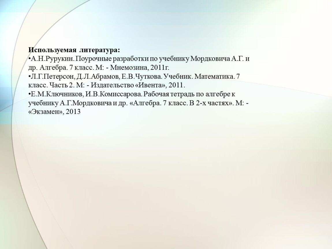 Л.Г.Петерсон, Д.Л.Абрамов, Е.В.Чуткова. Учебник. Математика. 7 класс. Часть 2. М: - Издательство «Ивента», 2011.
