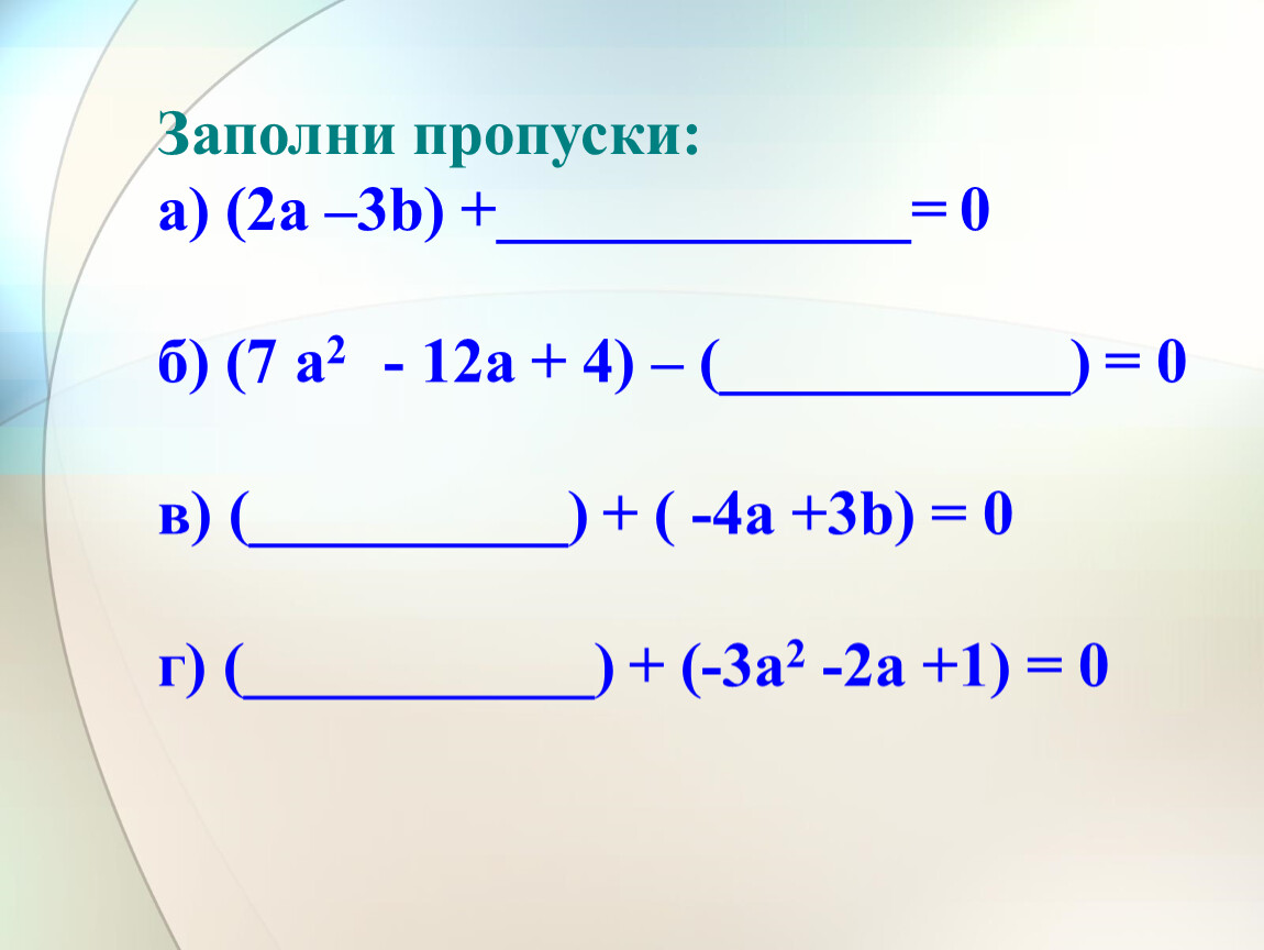 б) (7 a2 - 12a + 4) – (___________) = 0
