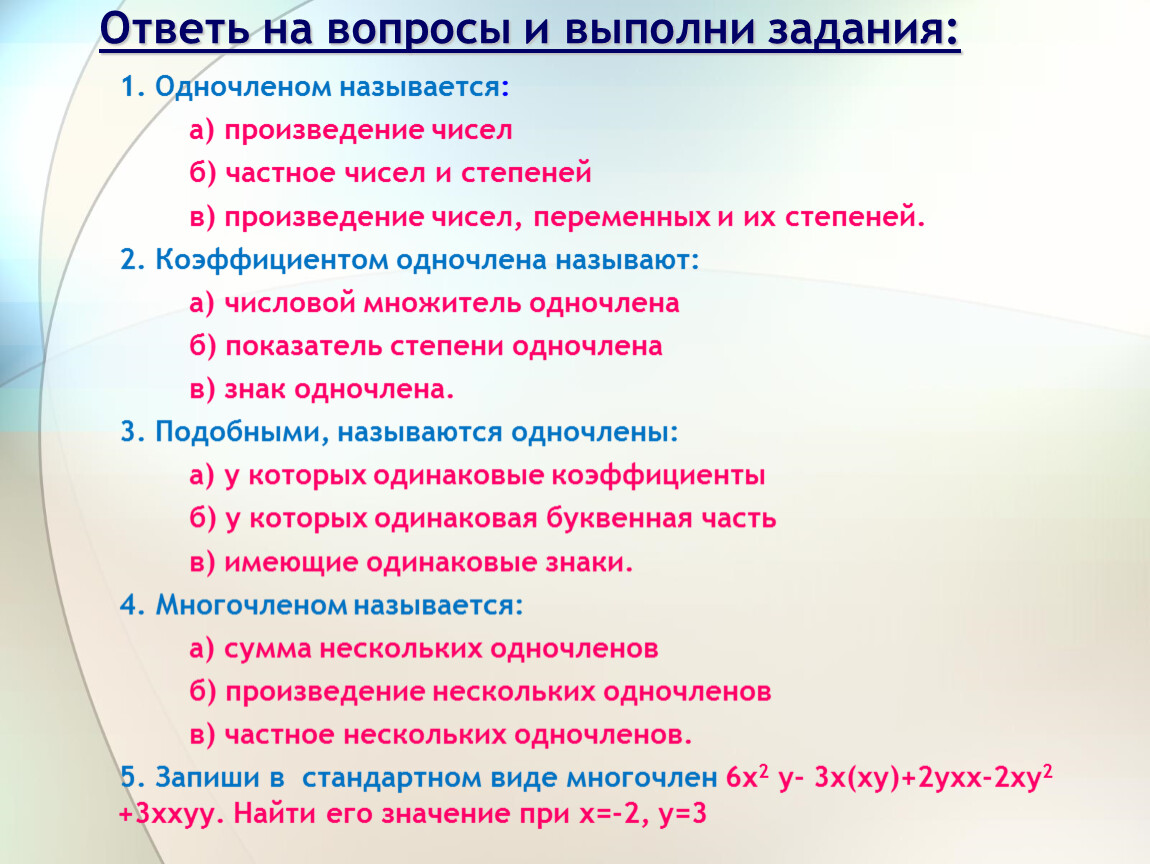 5. Запиши в стандартном виде многочлен 6х2 у- 3х(ху)+2ухх-2ху2 +3ххуу. Найти его значение при х=-2, у=3