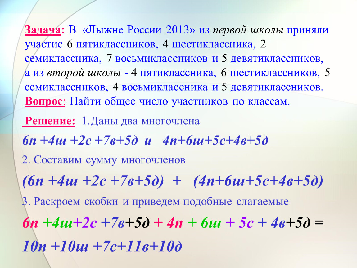 Задача: В «Лыжне России 2013» из первой школы приняли участие 6 пятиклассников, 4 шестиклассника, 2 семиклассника, 7 восьмиклассников и 5 девятиклассников, а из второй школы - 4 пятиклассника, 6 шестиклассников, 5 семиклассников, 4 восьмиклассника и 5 девятиклассников. Вопрос: Найти общее число участников по классам.