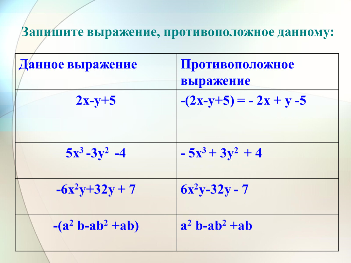2х-у+5 | -(2х-у+5) = - 2х + у -5 |