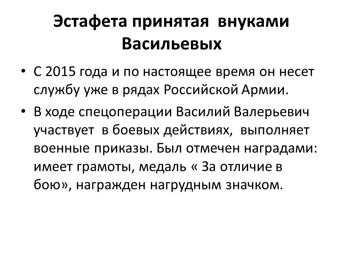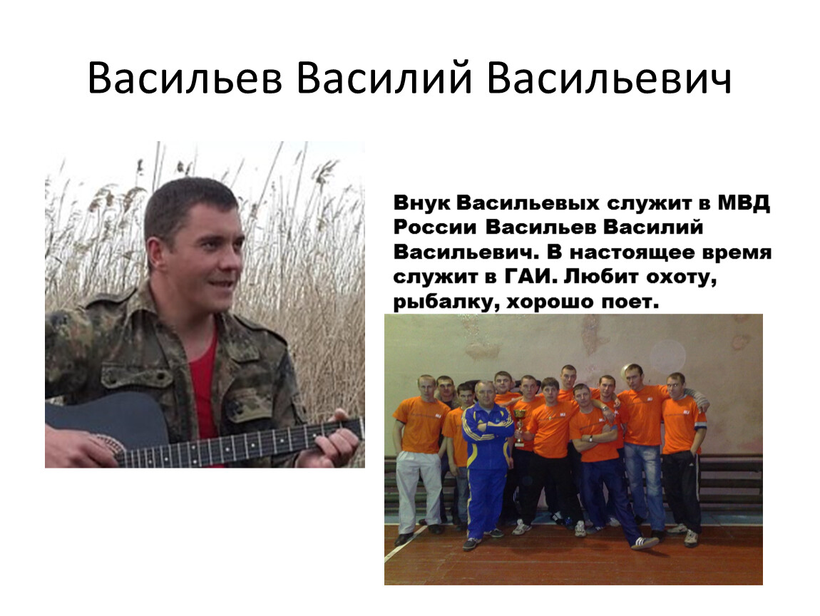 Внук Васильевых служит в МВД России Васильев Василий Васильевич. В настоящее время служит в ГАИ. Любит охоту, рыбалку, хорошо поет. занимается спортом.