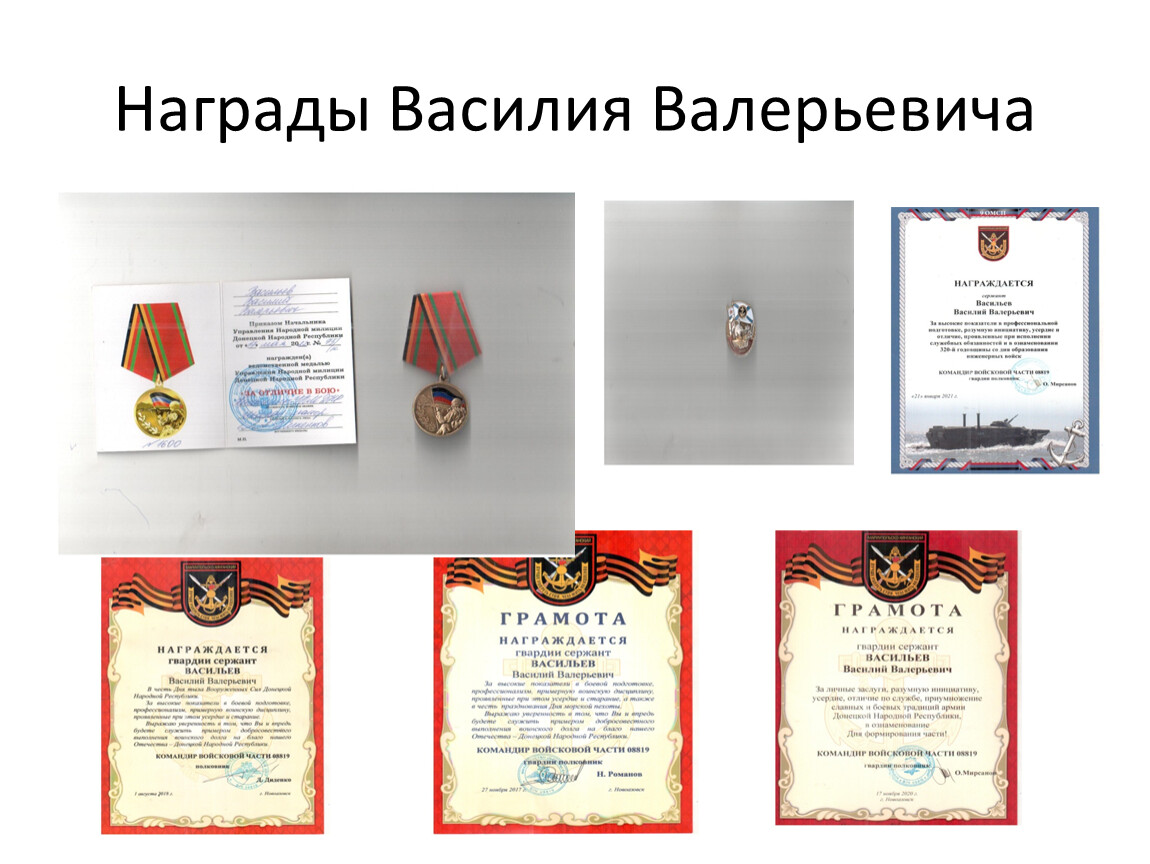 В ходе спецоперации Василий Валерьевич участвует в боевых действиях, выполняет военные приказы. Был отмечен наградами: имеет грамоты, медаль « За отличие в бою», награжден нагрудным значком.