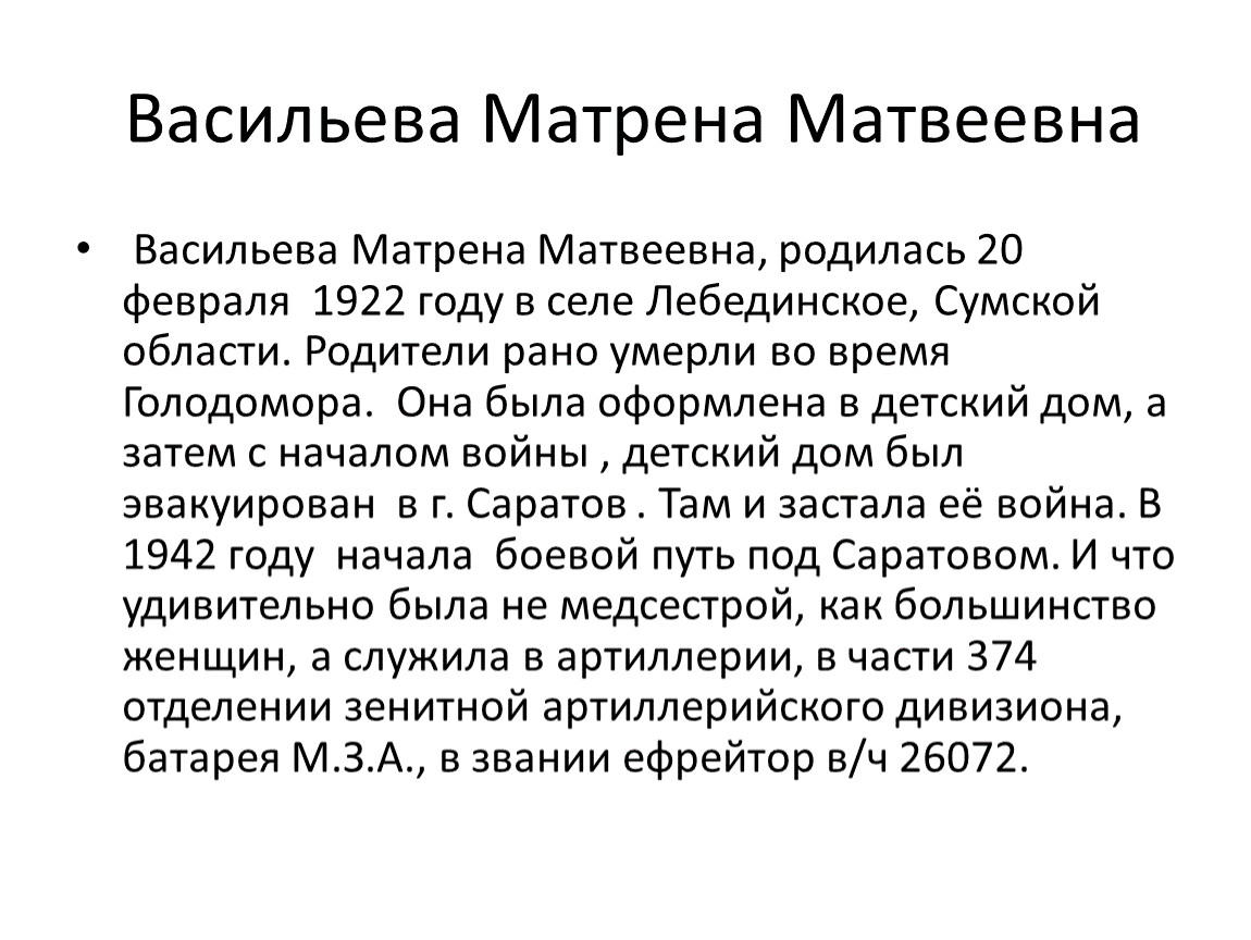 Васильева Матрена Матвеевна, родилась 20 февраля 1922 году в селе Лебединское, Сумской области. Родители рано умерли во время Голодомора. Она была оформлена в детский дом, а затем с началом войны , детский дом был эвакуирован в г. Саратов . Там и застала её война. В 1942 году начала боевой путь под Саратовом. И что удивительно была не медсестрой, как большинство женщин, а служила в артиллерии, в части 374 отделении зенитной артиллерийского дивизиона, батарея М.З.А., в звании ефрейтор в/ч 26072.