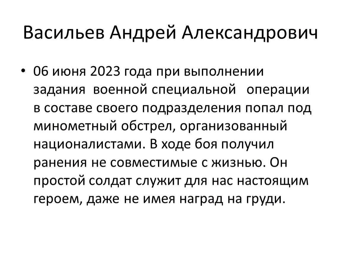 06 июня 2023 года при выполнении задания военной специальной операции в составе своего подразделения попал под минометный обстрел, организованный националистами. В ходе боя получил ранения не совместимые с жизнью. Он простой солдат служит для нас настоящим героем, даже не имея наград на груди.
