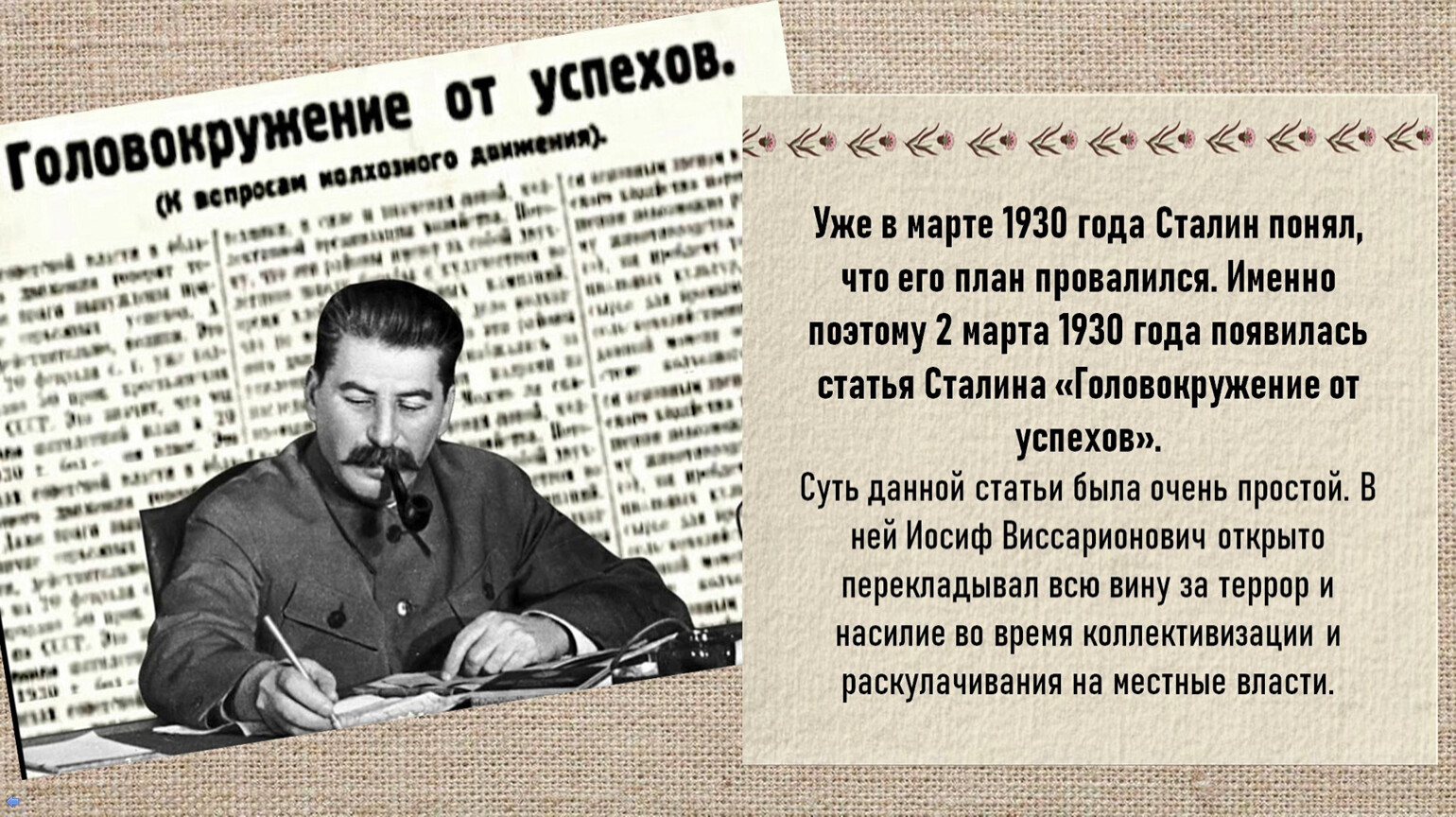 Ужевмарте1930года Сталинпонял, чтоегопланпровалился. Именно поэтому 2 марта 1930 года появилась статьяСталина «Головокружение от успехов».