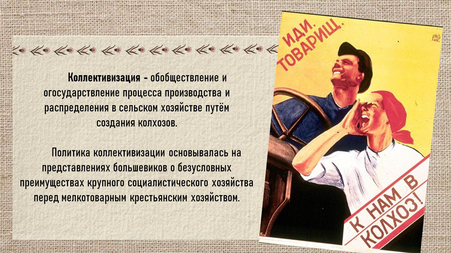 Коллективизациясоздавала колхозы, которыеобеспечивали страну продовольствием, бесплатнойилиоченьдешевой рабочейсилой, а такжерабочими руками, с помощьюкоторых проходила индустриализация.