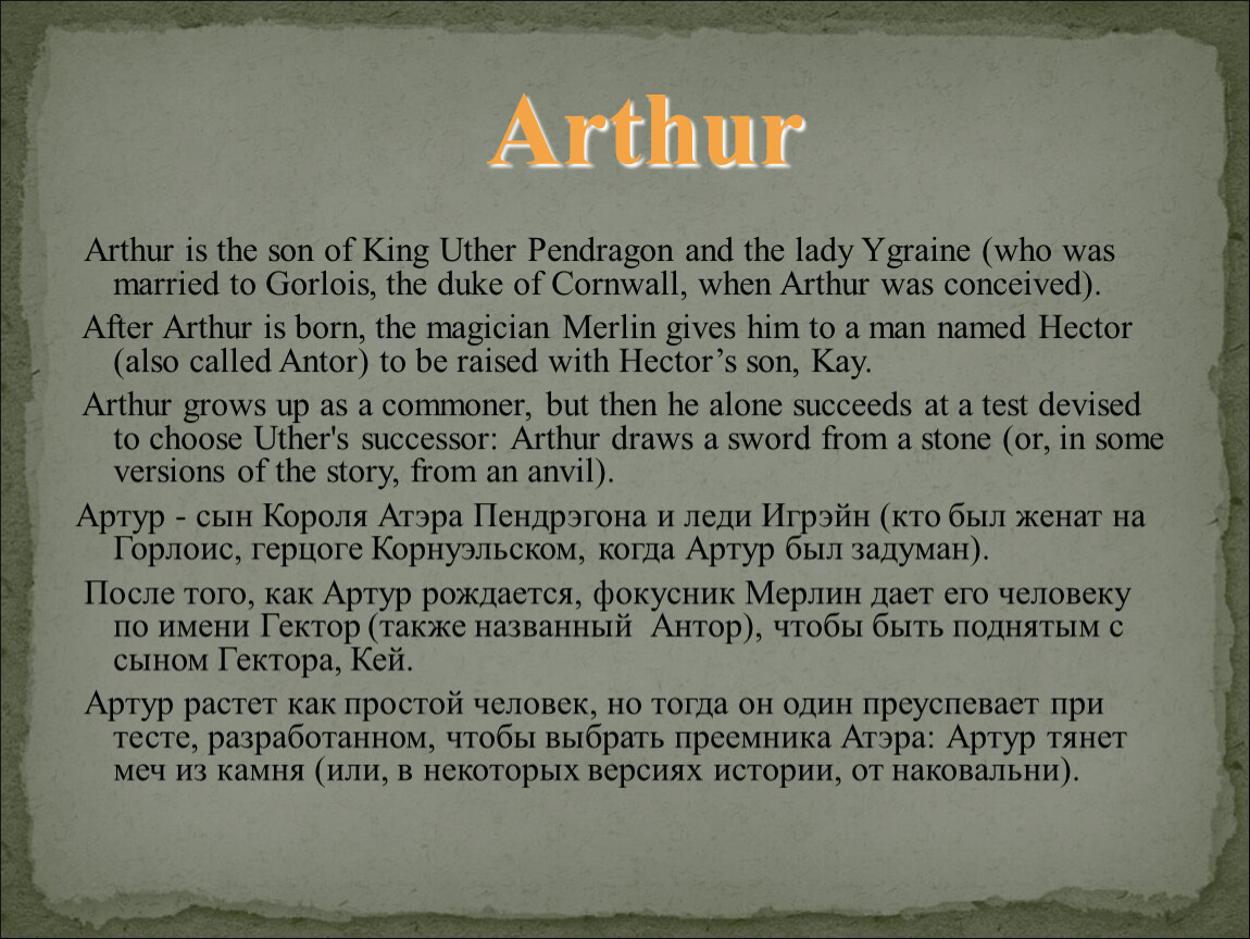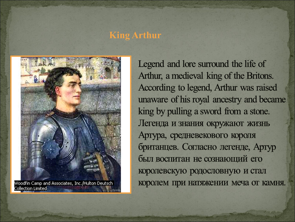 Legend and lore surround the life of Arthur, a medieval king of the Britons. According to legend, Arthur was raised unaware of his royal ancestry and became king by pulling a sword from a stone.Легенда и знания окружают жизнь Артура, средневекового короля британцев. Согласно легенде, Артур был воспитан не сознающий его королевскую родословную и стал королем при натяжении меча от камня.
