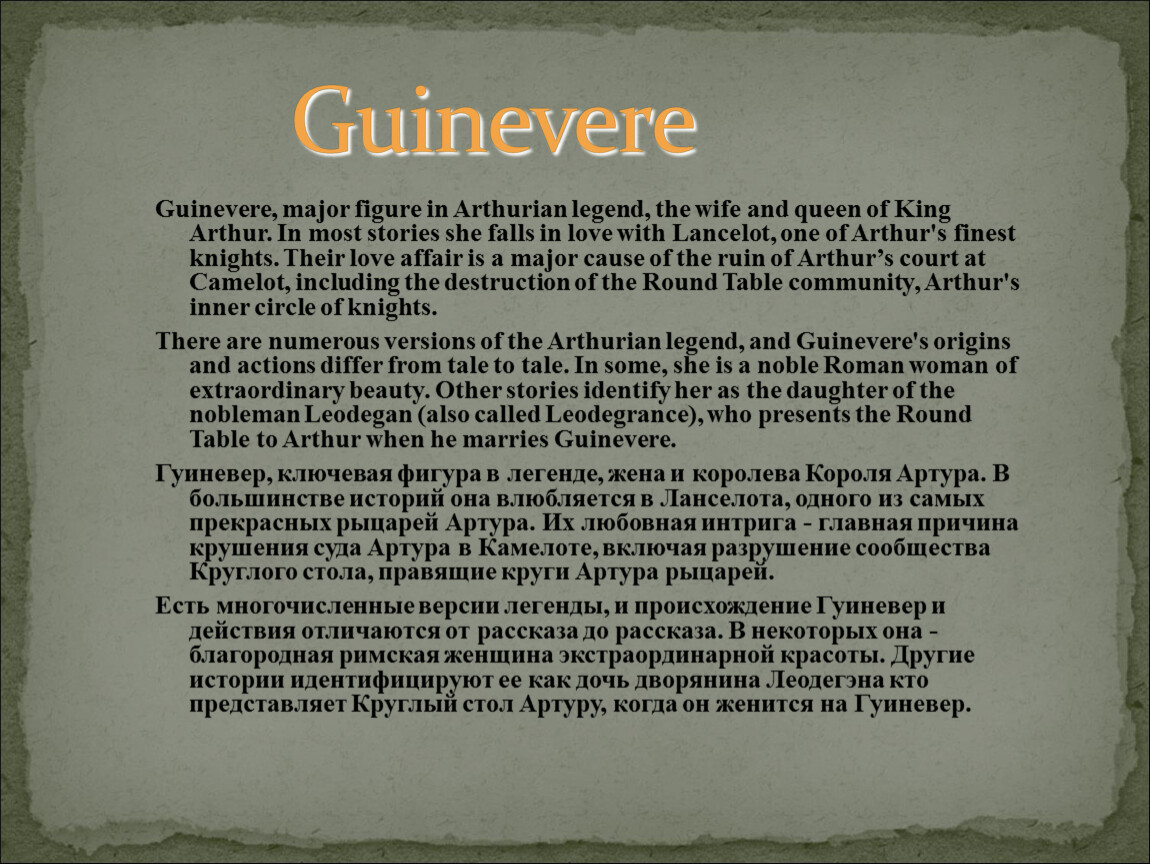 Гуиневер, ключевая фигура в легенде, жена и королева Короля Артура. В большинстве историй она влюбляется в Ланселота, одного из самых прекрасных рыцарей Артура. Их любовная интрига - главная причина крушения суда Артура в Камелоте, включая разрушение сообщества Круглого стола, правящие круги Артура рыцарей.