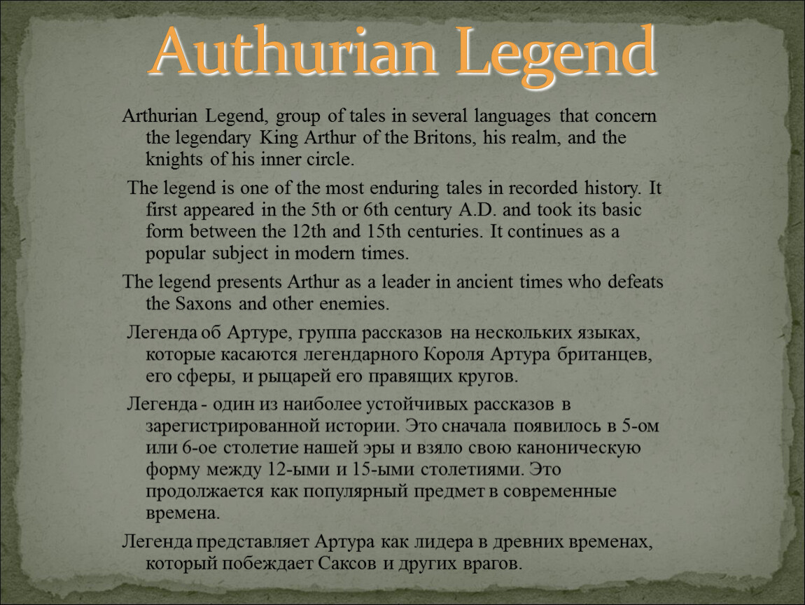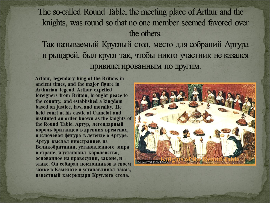Arthur, legendary king of the Britons in ancient times, and the major figure in Arthurian legend. Arthur expelled foreigners from Britain, brought peace to the country, and established a kingdom based on justice, law, and morality. He held court at his castle at Camelot and instituted an order known as the knights of the Round Table. Артур, легендарный король британцев в древних временах, и ключевая фигура в легенде о Артуре. Артур выслал иностранцев из Великобритании, установленного мира в стране, и установил королевство, основанное на правосудии, законе, и этике. Он собирал поклонников в своем замке в Камелоте и устанавливал заказ, известный как рыцари Круглого стола.