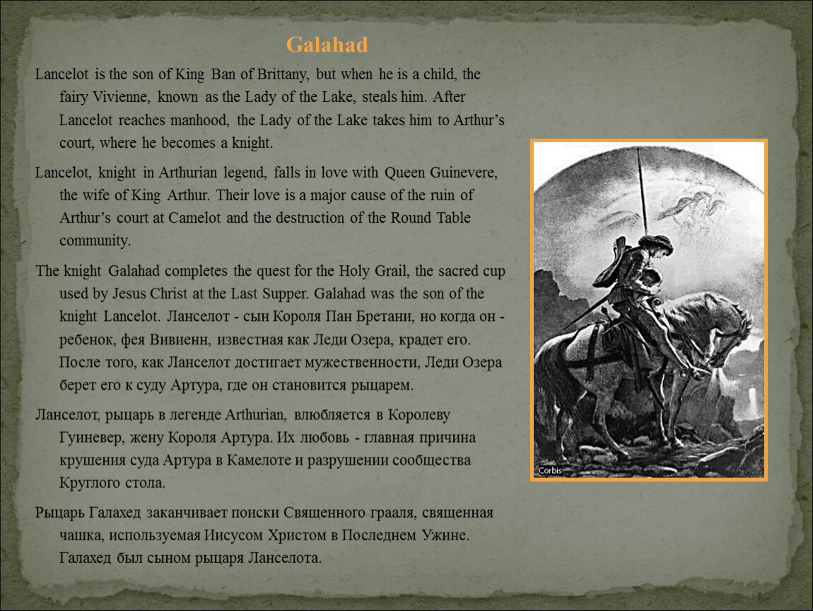 The knight Galahad completes the quest for the Holy Grail, the sacred cup used by Jesus Christ at the Last Supper. Galahad was the son of the knight Lancelot. Ланселот - сын Короля Пан Бретани, но когда он - ребенок, фея Вивиенн, известная как Леди Озера, крадет его. После того, как Ланселот достигает мужественности, Леди Озера берет его к суду Артура, где он становится рыцарем.