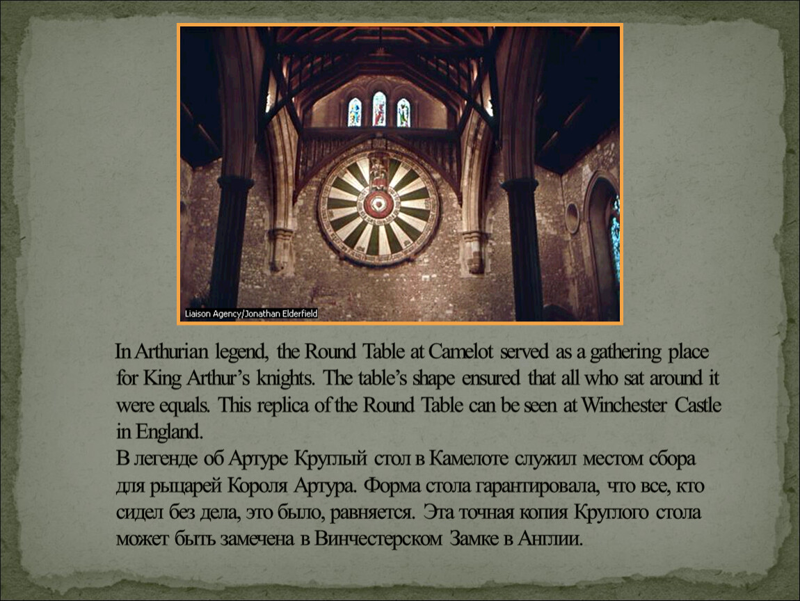 In Arthurian legend, the Round Table at Camelot served as a gathering place for King Arthur’s knights. The table’s shape ensured that all who sat around it were equals. This replica of the Round Table can be seen at Winchester Castle in England. В легенде об Артуре Круглый стол в Камелоте служил местом сбора для рыцарей Короля Артура. Форма стола гарантировала, что все, кто сидел без дела, это было, равняется. Эта точная копия Круглого стола может быть замечена в Винчестерском Замке в Англии.