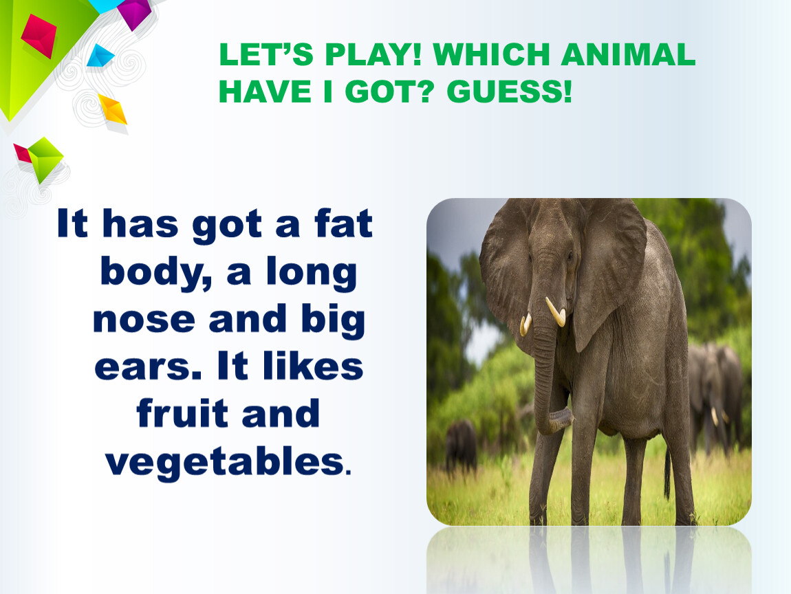 It has got a fat body, a long nose and big ears. It likes fruit and vegetables.