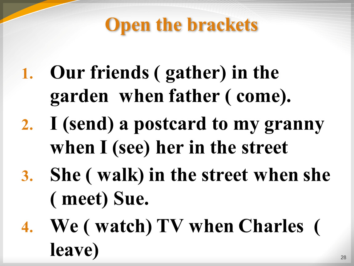 Our friends ( gather) in the garden when father ( come).