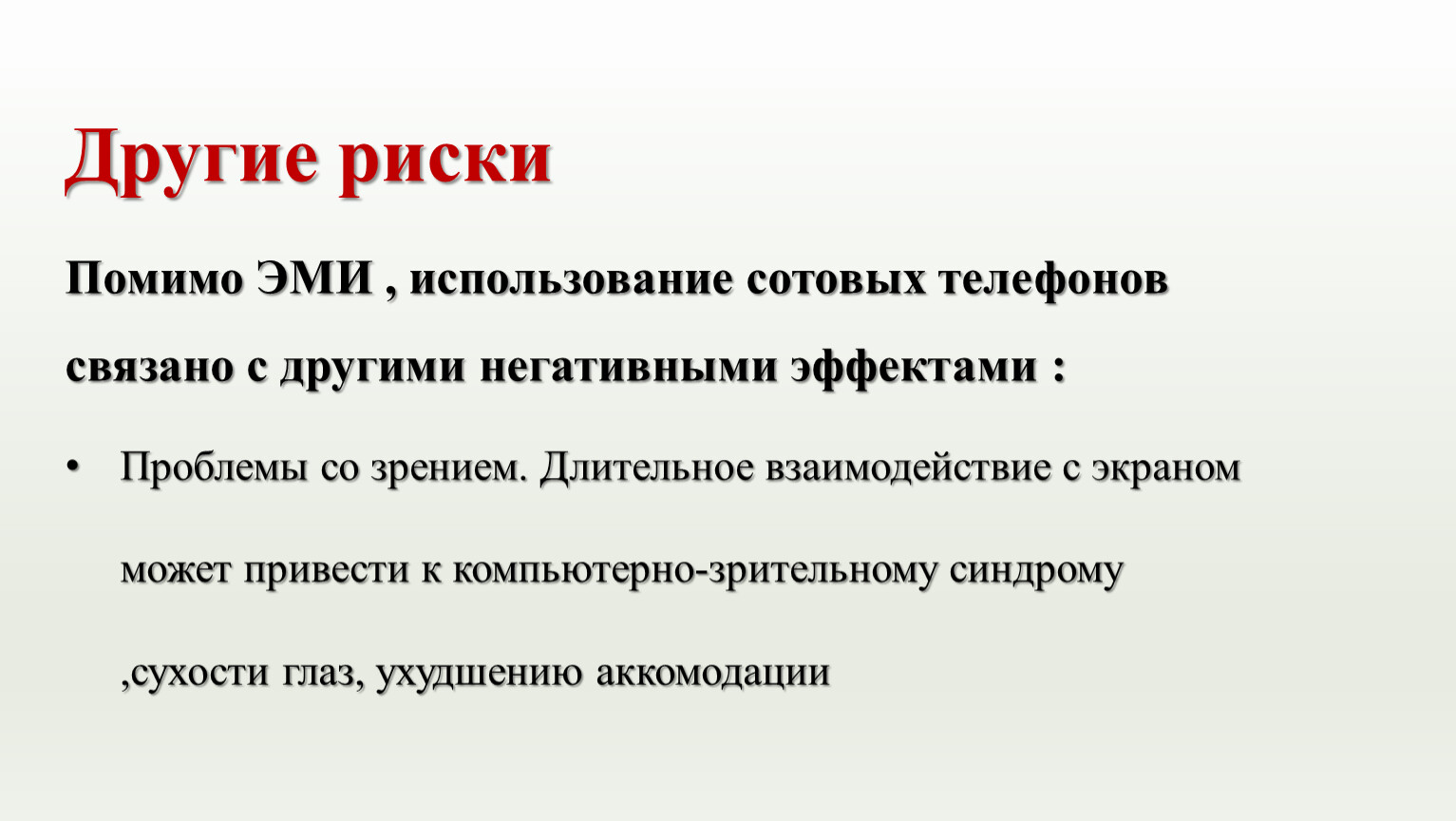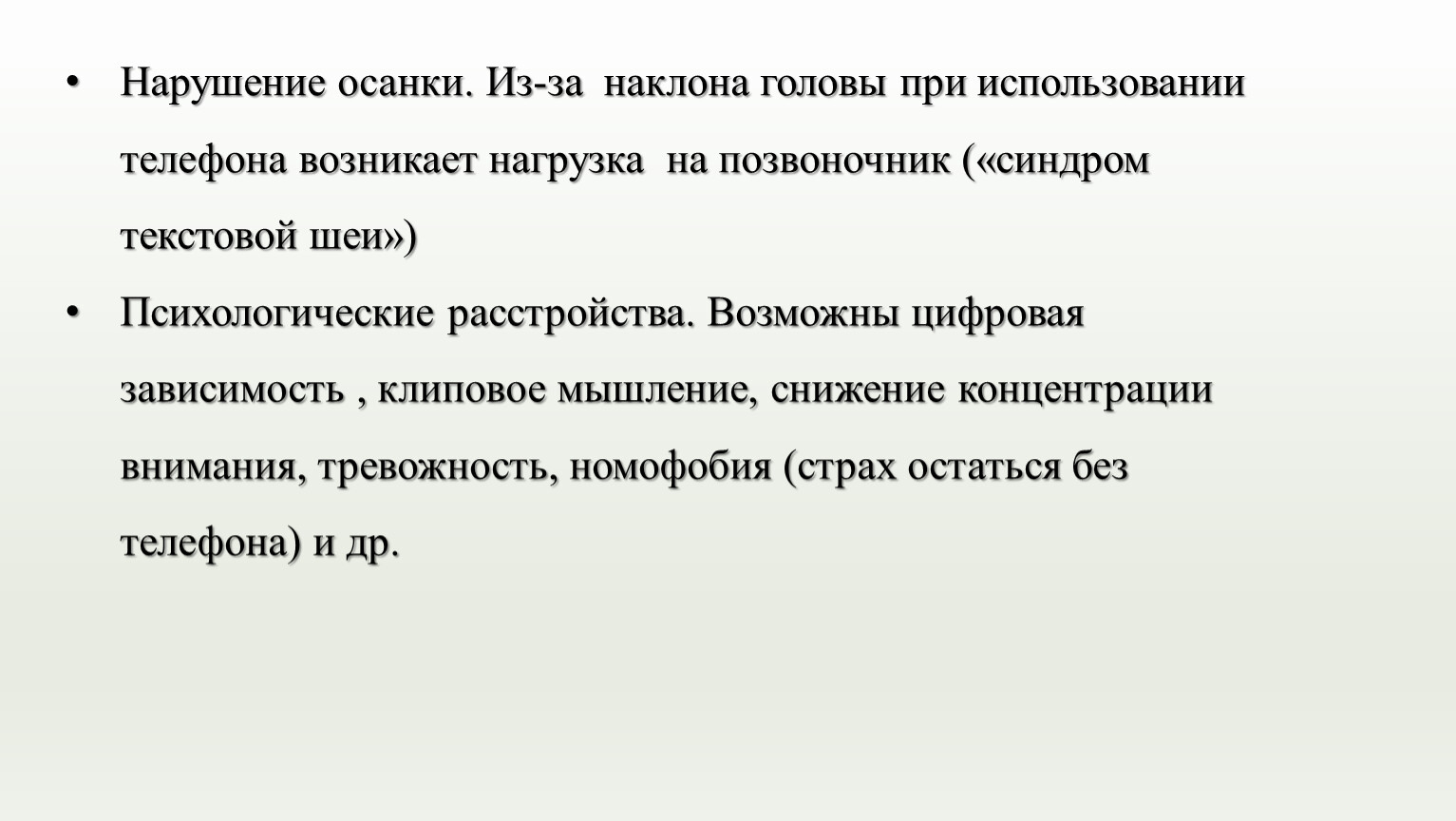 Психологические расстройства. Возможны цифровая зависимость , клиповое мышление, снижение концентрации внимания, тревожность, номофобия (страх остаться без телефона) и др.