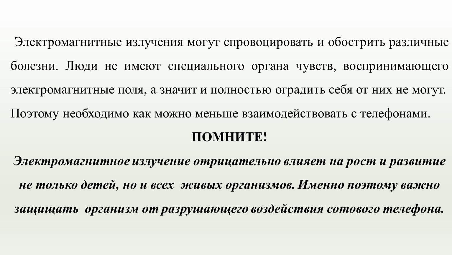 Электромагнитные излучения могут спровоцировать и обострить различные болезни. Люди не имеют специального органа чувств, воспринимающего электромагнитные поля, а значит и полностью оградить себя от них не могут.