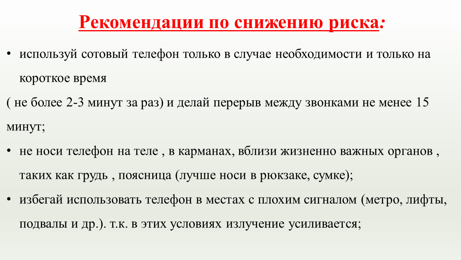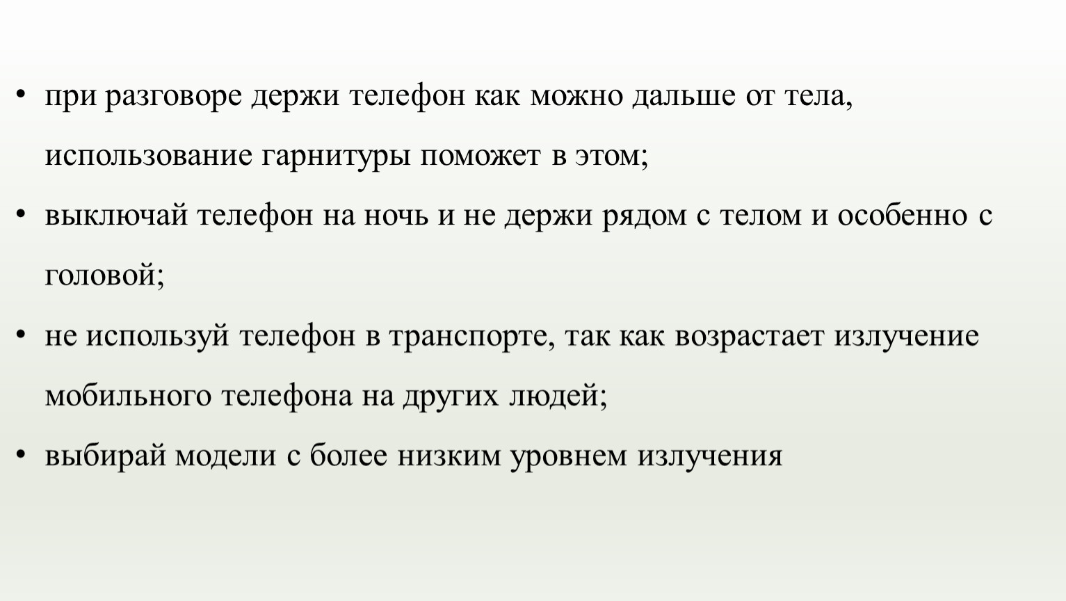 не используй телефон в транспорте, так как возрастает излучение мобильного телефона на других людей;