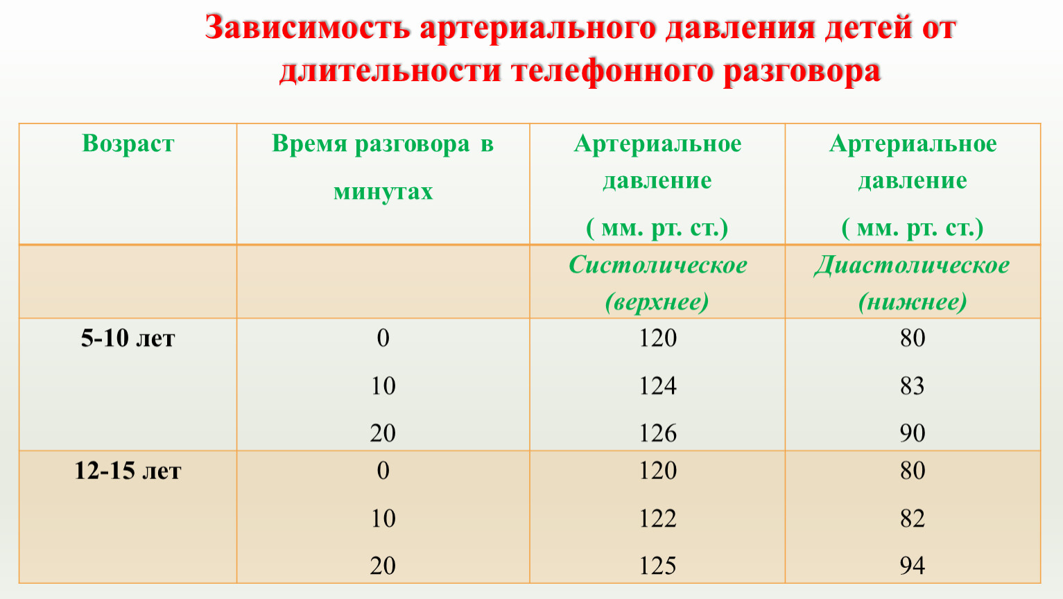 Зависимость артериального давления детей от длительности телефонного разговора