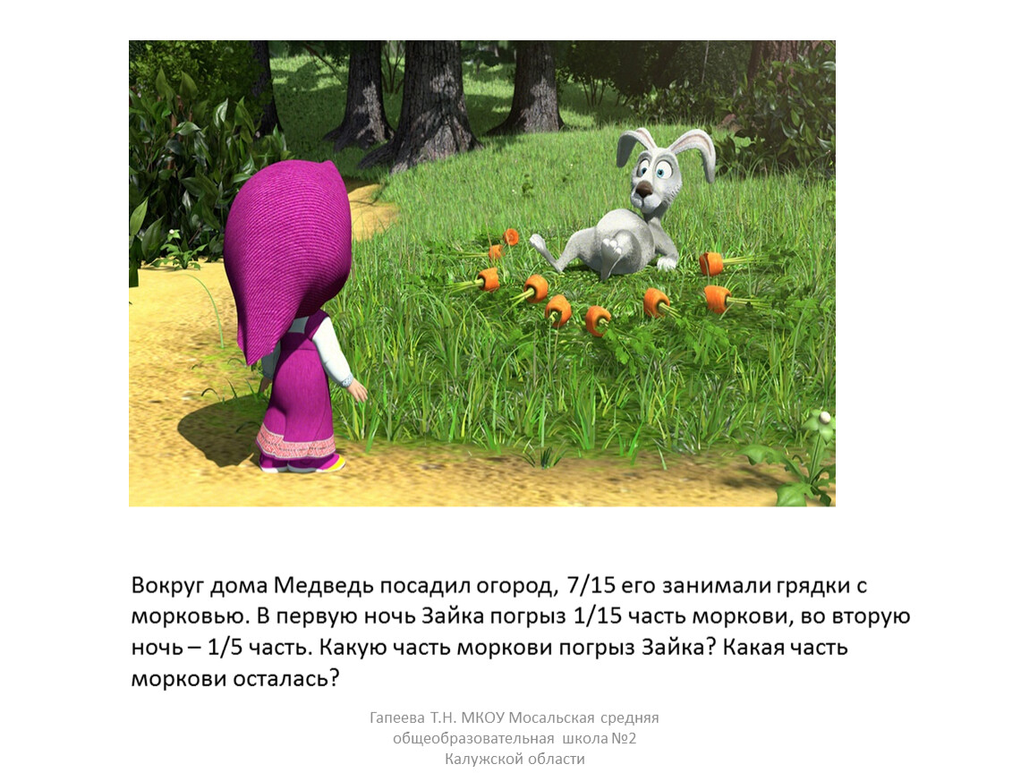 Вокруг дома Медведь посадил огород, 7/15 его занимали грядки с морковью. В первую ночь Зайка погрыз 1/15 часть моркови, во вторую ночь – 1/5 часть. Какую часть моркови погрыз Зайка? Какая часть моркови осталась?